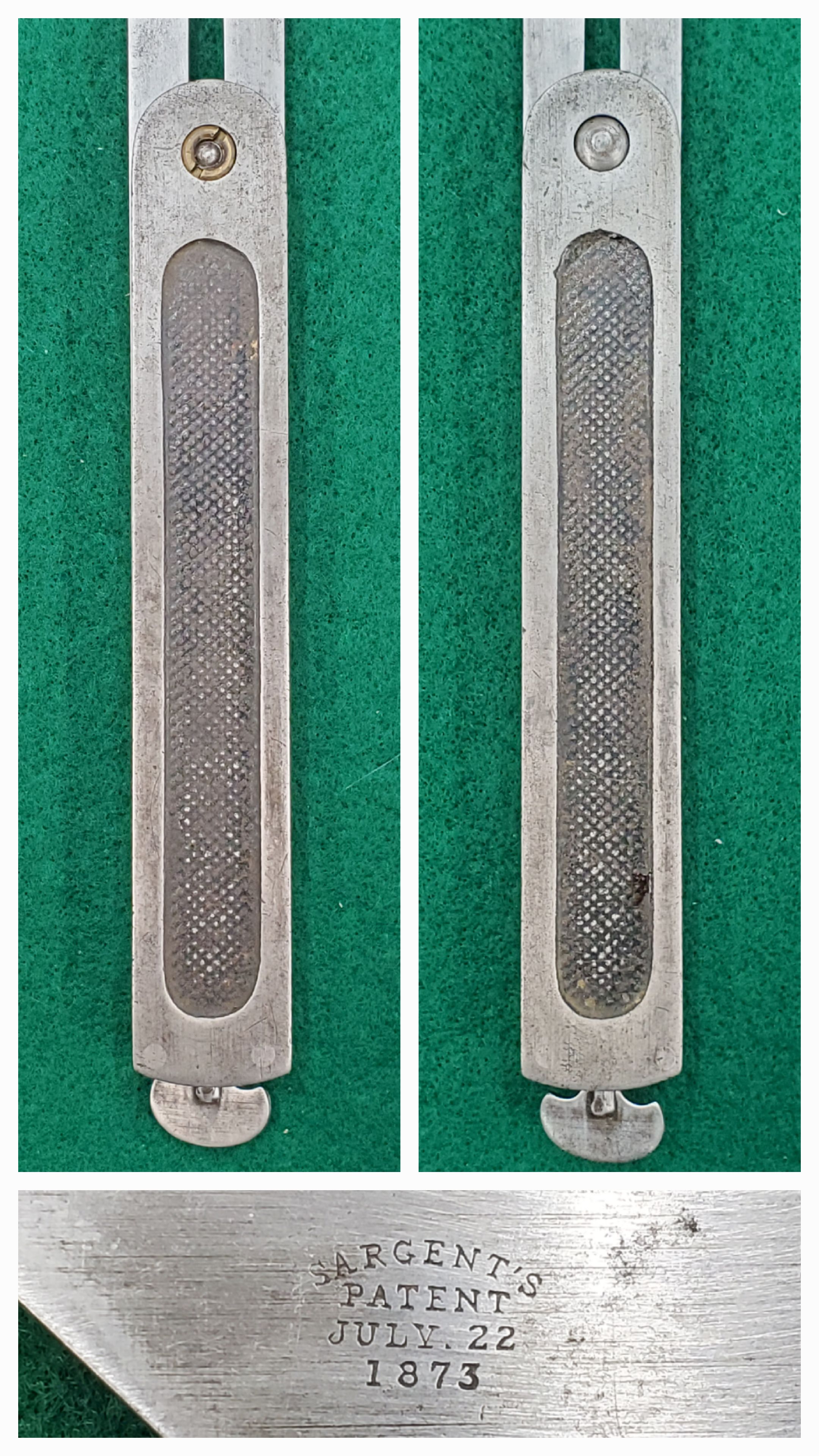 Known as Sargent’s July 22, 1873 patent bevel, this was offered starting in the 1874 catalog. It was the first all metal handled bevel made by Stanley. It features stippled oval grips which have been japanned black. Both sides of the handle are identical in thickness and style, with no markings. Thre are two variations depending on the orientation of the patent info on the blade. Variation 1 is earlier, although the exact date of the change is unknown. [Full Image]