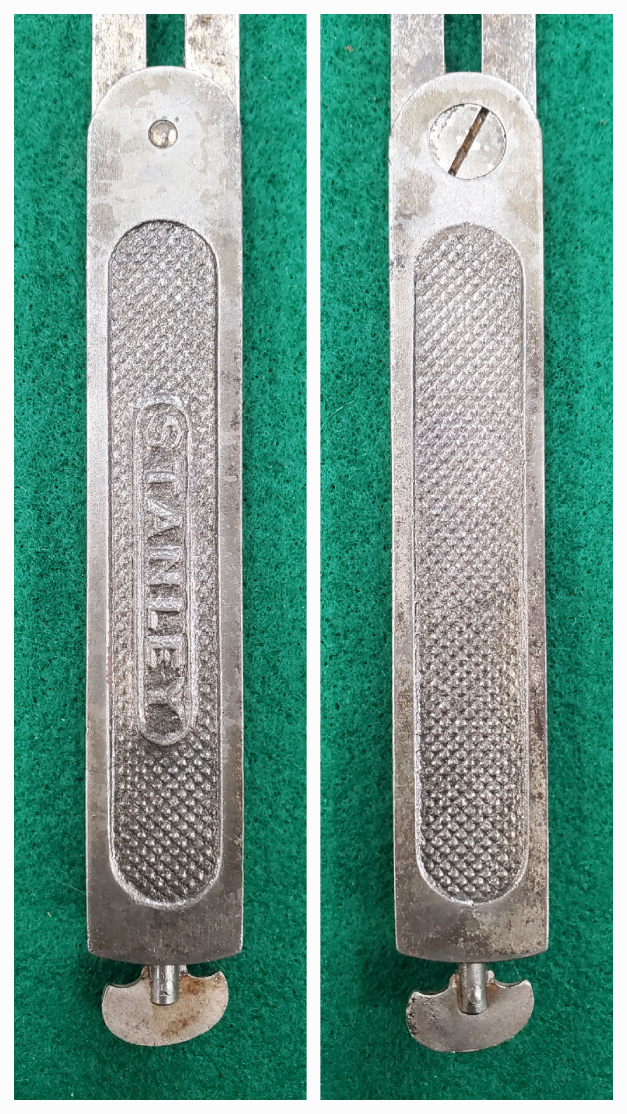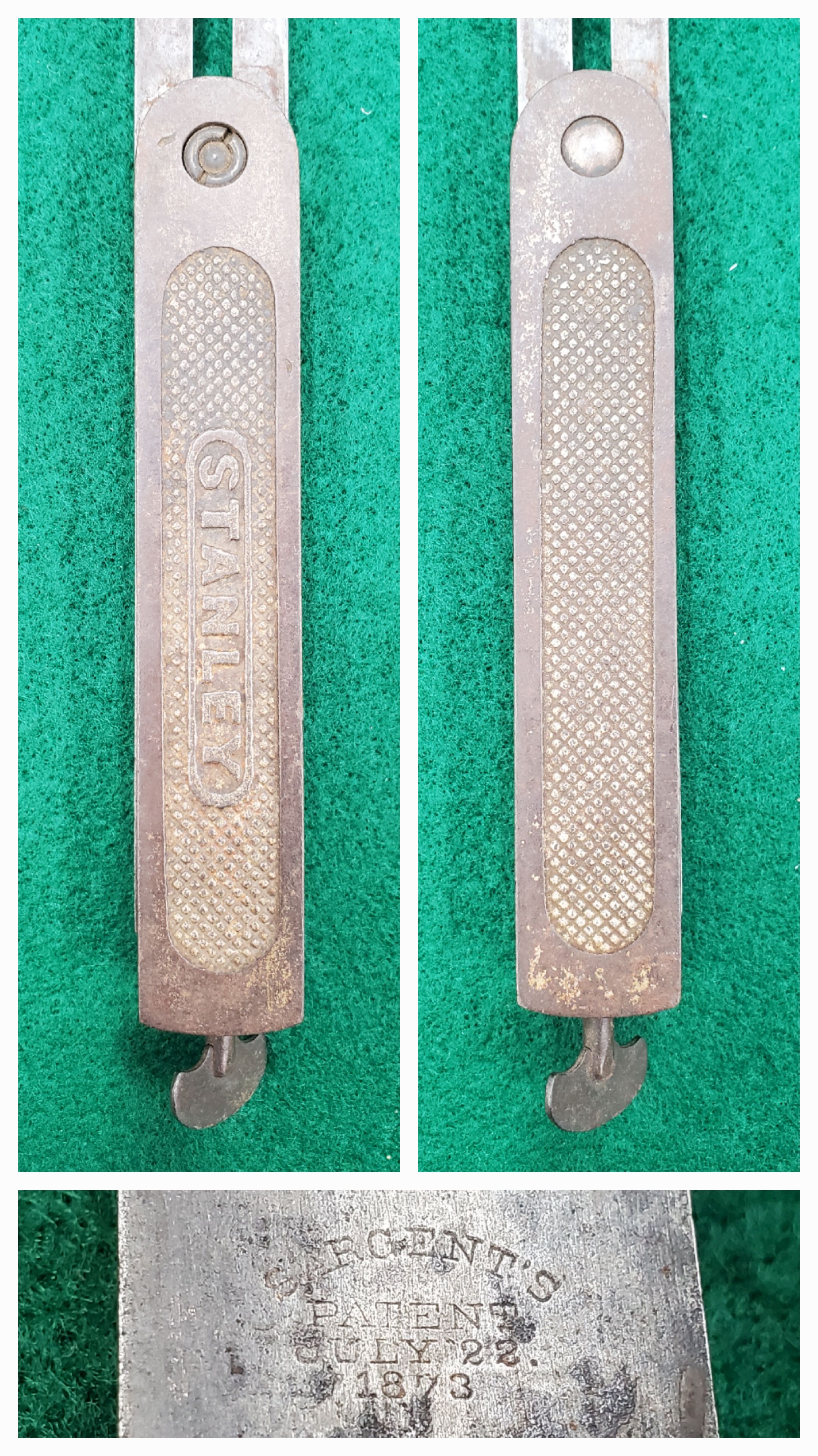 Same patent design as A, but with cosmetic differences. One side now sports “STANLEY” and the grip areas are nickel plated with the rest of the handle. Both sides of the handle remain the same thickness. There are two variations, likely due to the patent running out and the patent info being removed from the blade. This change would have happend about 1890. [Full Image]