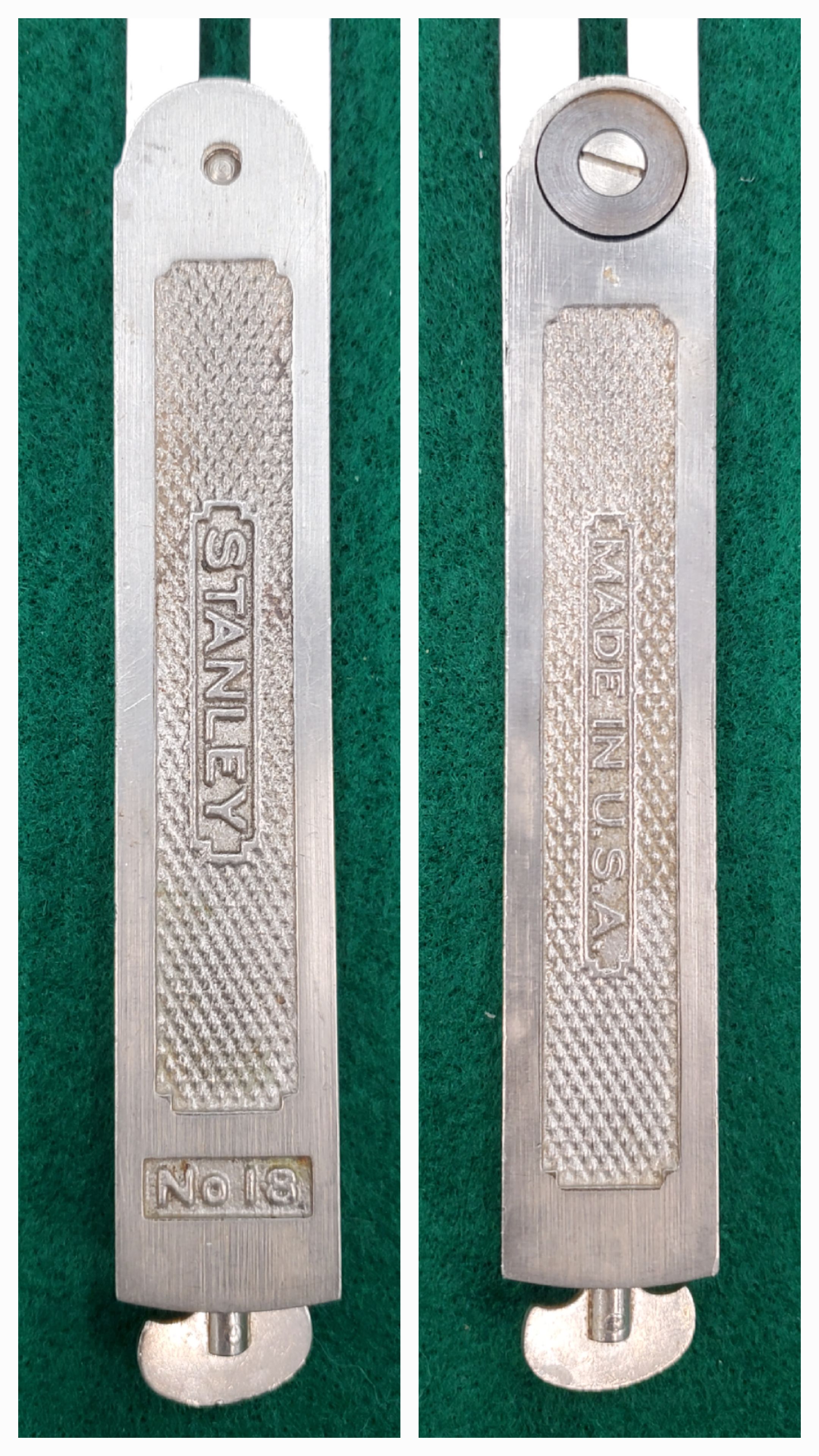 The patent date is no longer present anywhere on the bevel. “STANLEY" continues on one side while the patent date is replaced on the other by "MADE IN U.S.A". The style of stippling has changed as well. H and I are both scarce and were probably manufactured for a short period of time. [Full Image]