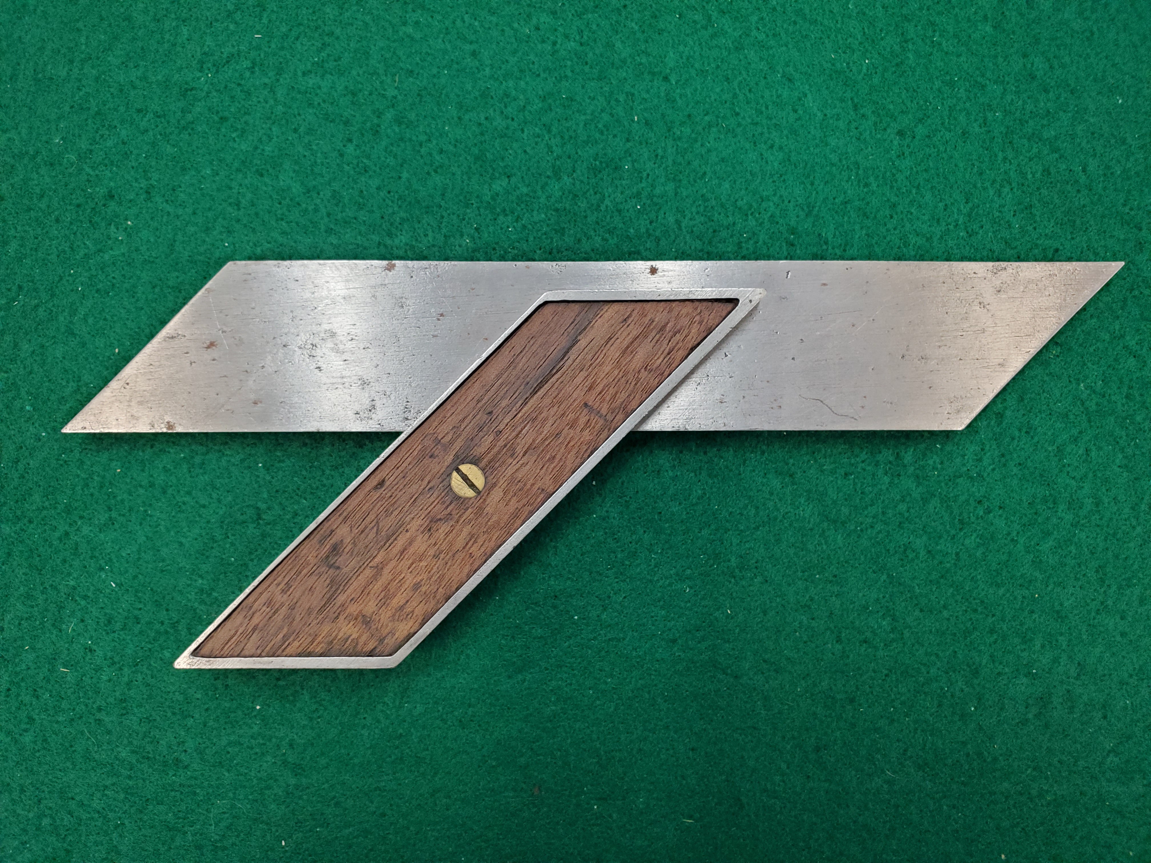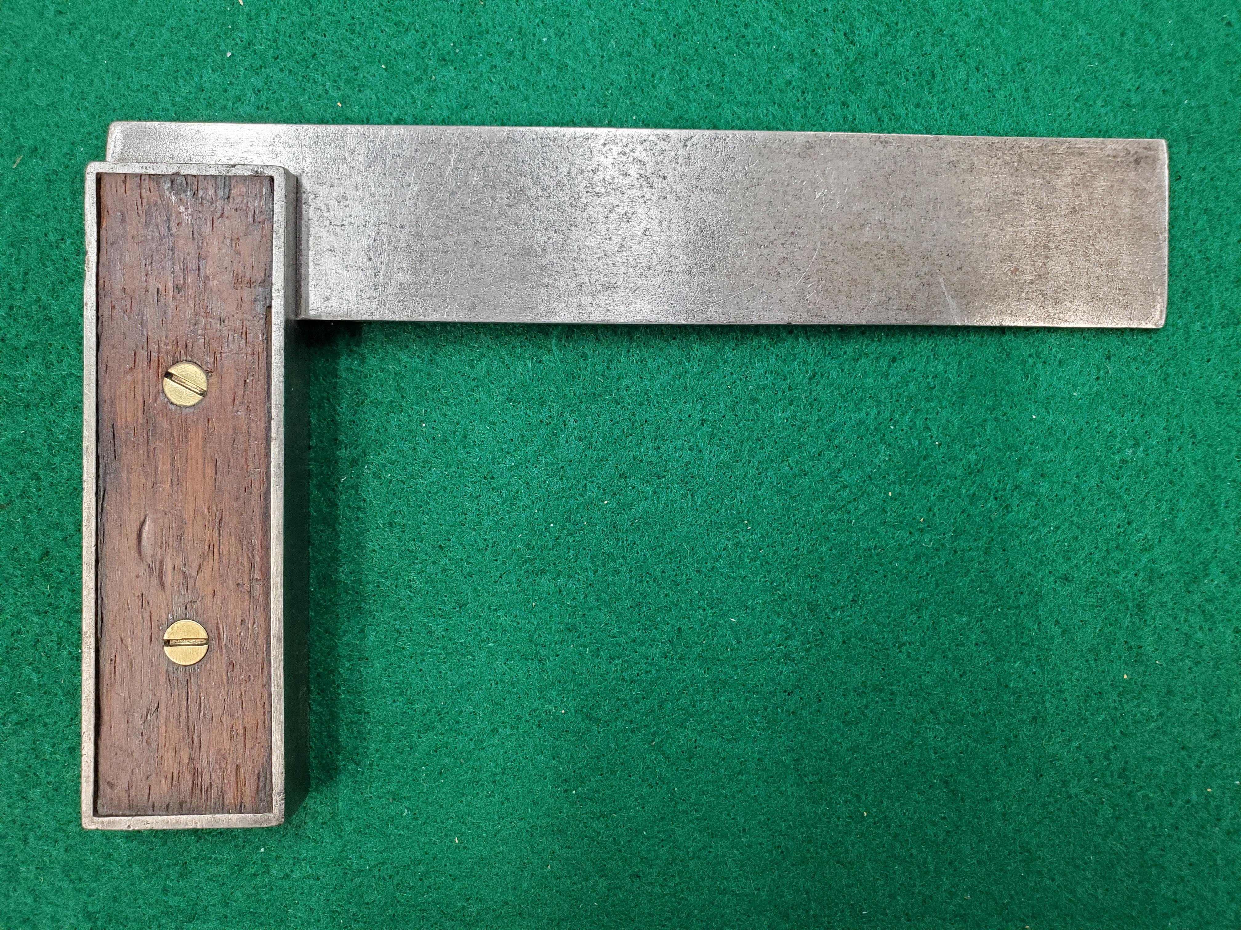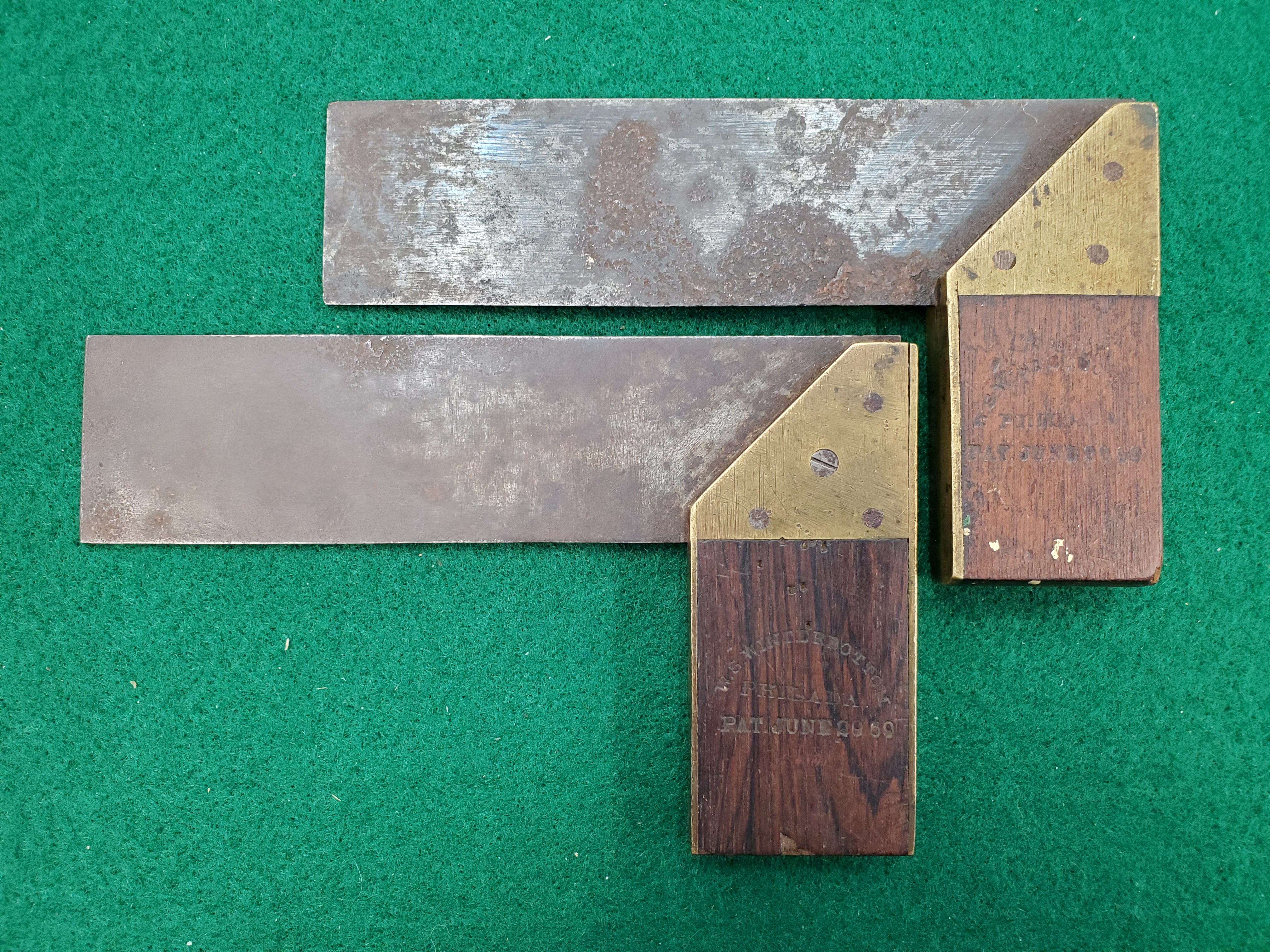 Introduced in 1874 as the “Winterbottom’s Patent Combined Try and Miter Square No 1”, this uses both Winterbottom’s June 29, 1869 and Justus Traut’s May 26, 1874 patents. Traut’s was for surrounding the blade rivets with lead. It was designated the model No 1 in 1888. Modeled after the No 10, which was introduced a few years earlier, the handles have walnut infill on each side. The steel screws pass through holes in the handle and screw into the other infill, essentially clamping the two thin pieces onto the handle. In 1888 it was permanently designated the as the No 1. Sometime late in production, the lead was omitted, with the rivets ground flush to the body (Variation 2). This type is sometimes marked with both patent dates on one of the wood scales. Many times they are not though, and they never have any Stanley branding. Variation 2 is much less common than Variation 1. The 4” size is the least common. (8", 6", 4")
