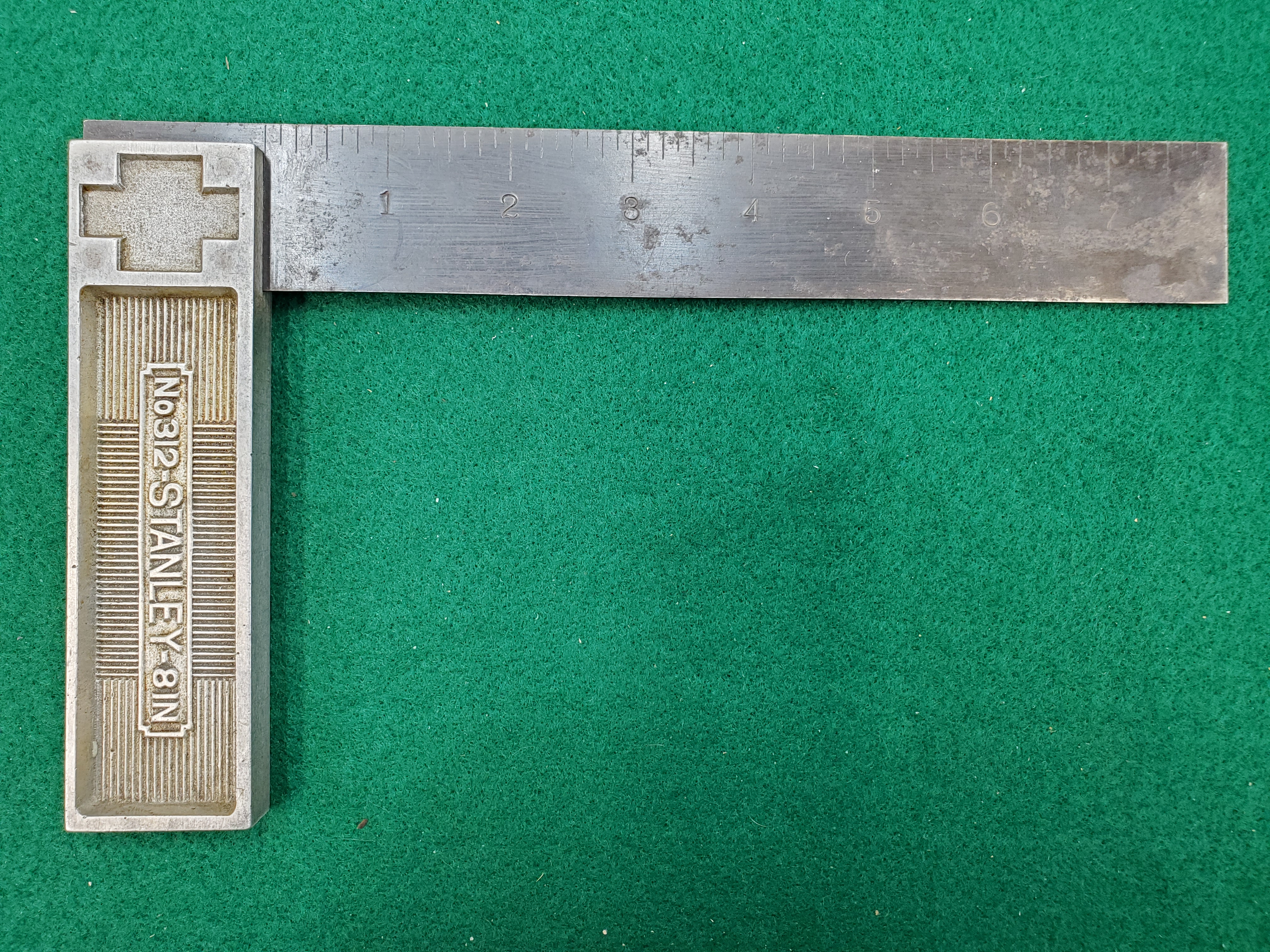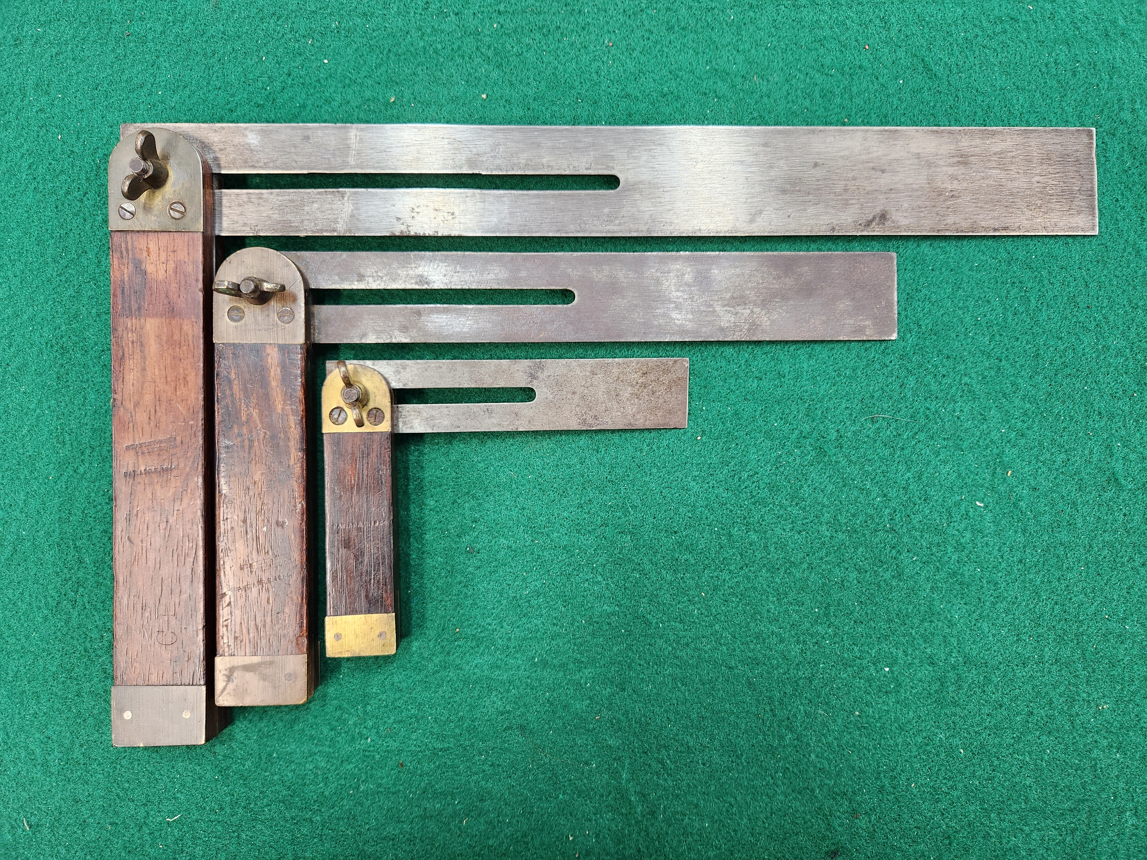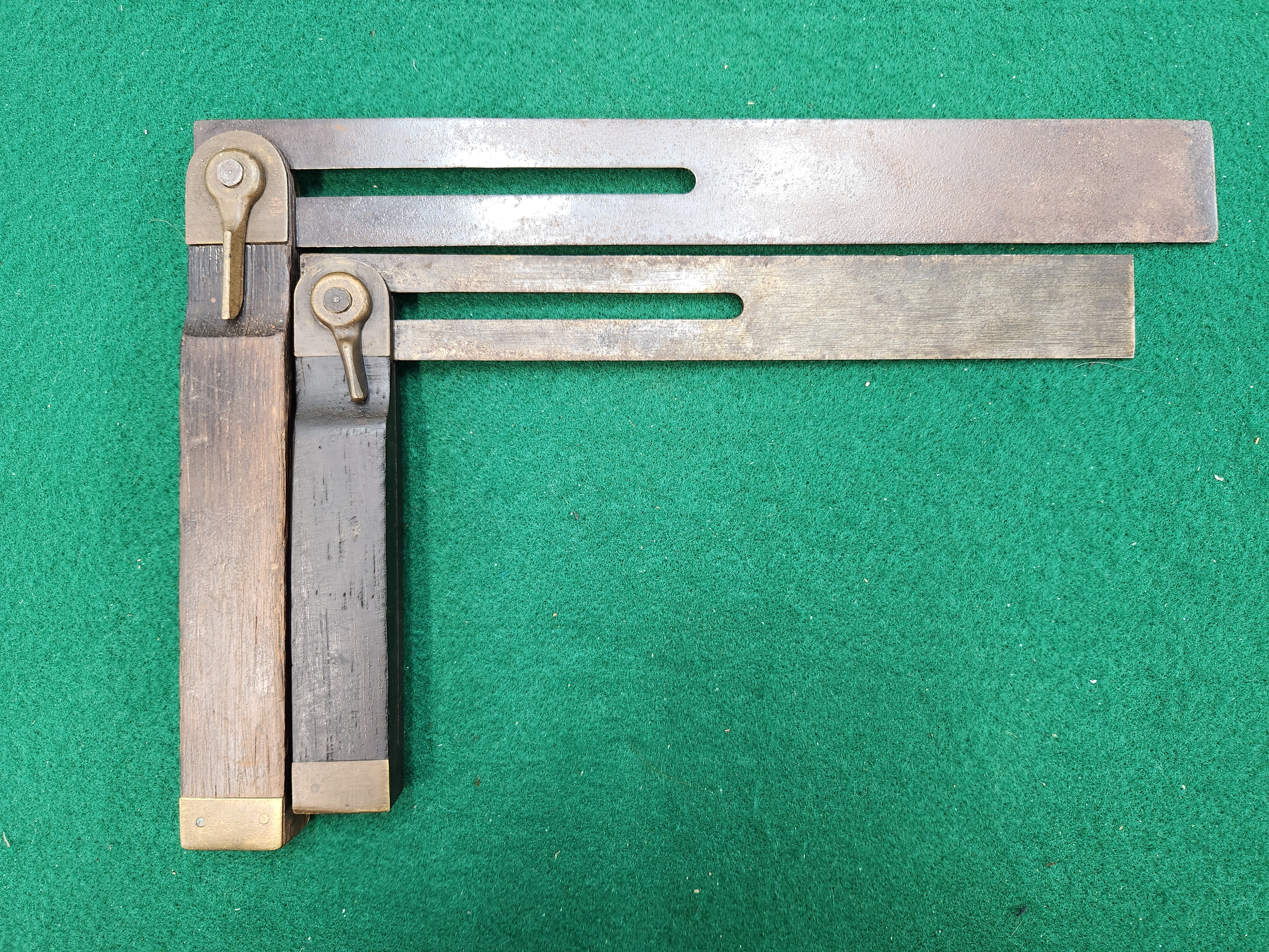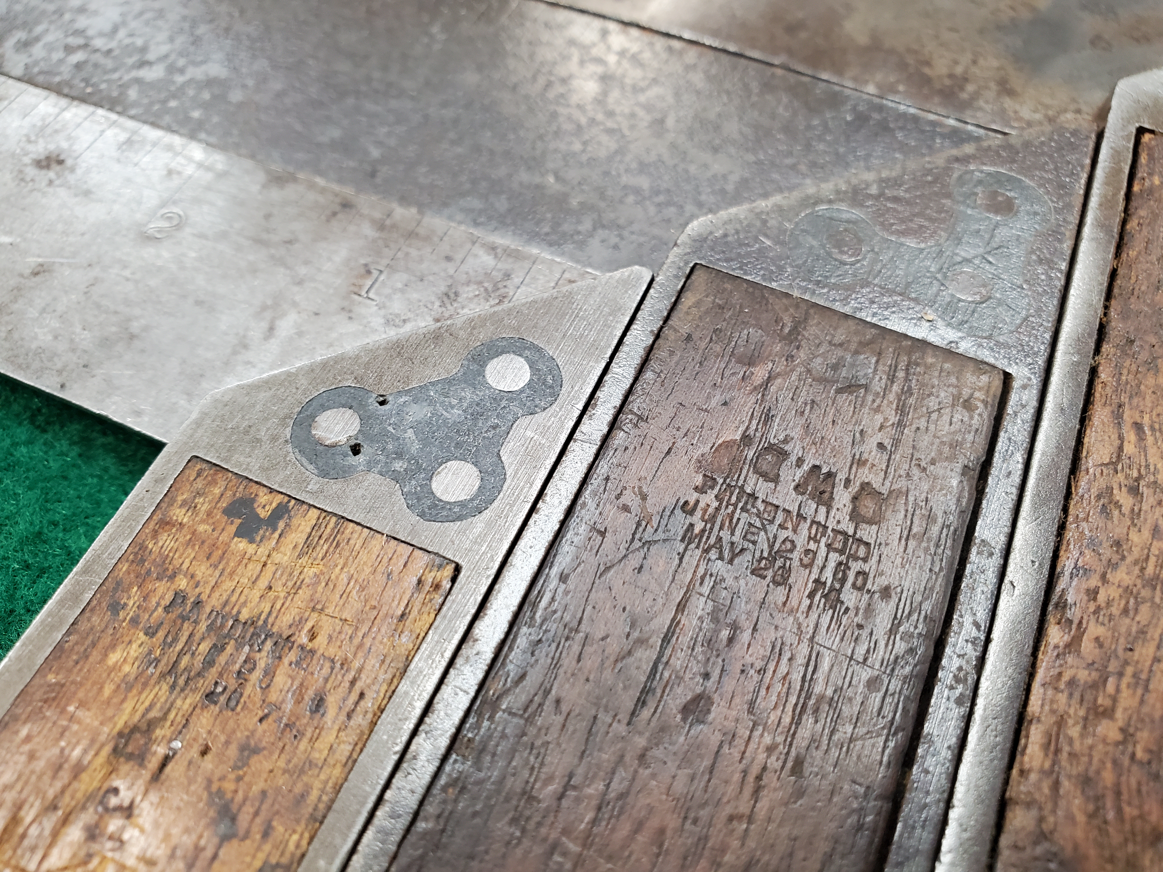 Introduced in 1874 as the “Winterbottom’s Patent Combined Try and Miter Square No 1”, this uses both Winterbottom’s June 29, 1869 and Justus Traut’s May 26, 1874 patents. Traut’s was for surrounding the blade rivets with lead. It was designated the model No 1 in 1888. Modeled after the No 10, which was introduced a few years earlier, the handles have walnut infill on each side. The steel screws pass through holes in the handle and screw into the other infill, essentially clamping the two thin pieces onto the handle. In 1888 it was permanently designated the as the No 1. Sometime late in production, the lead was omitted, with the rivets ground flush to the body (Variation 2). This type is sometimes marked with both patent dates on one of the wood scales. Many times they are not though, and they never have any Stanley branding. Variation 2 is much less common than Variation 1. The 4” size is the least common. (8", 6", 4")