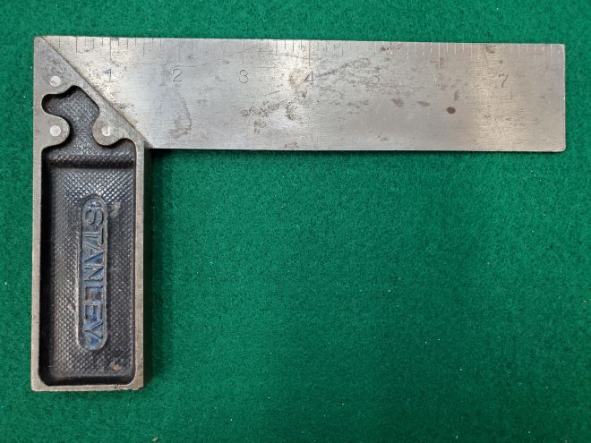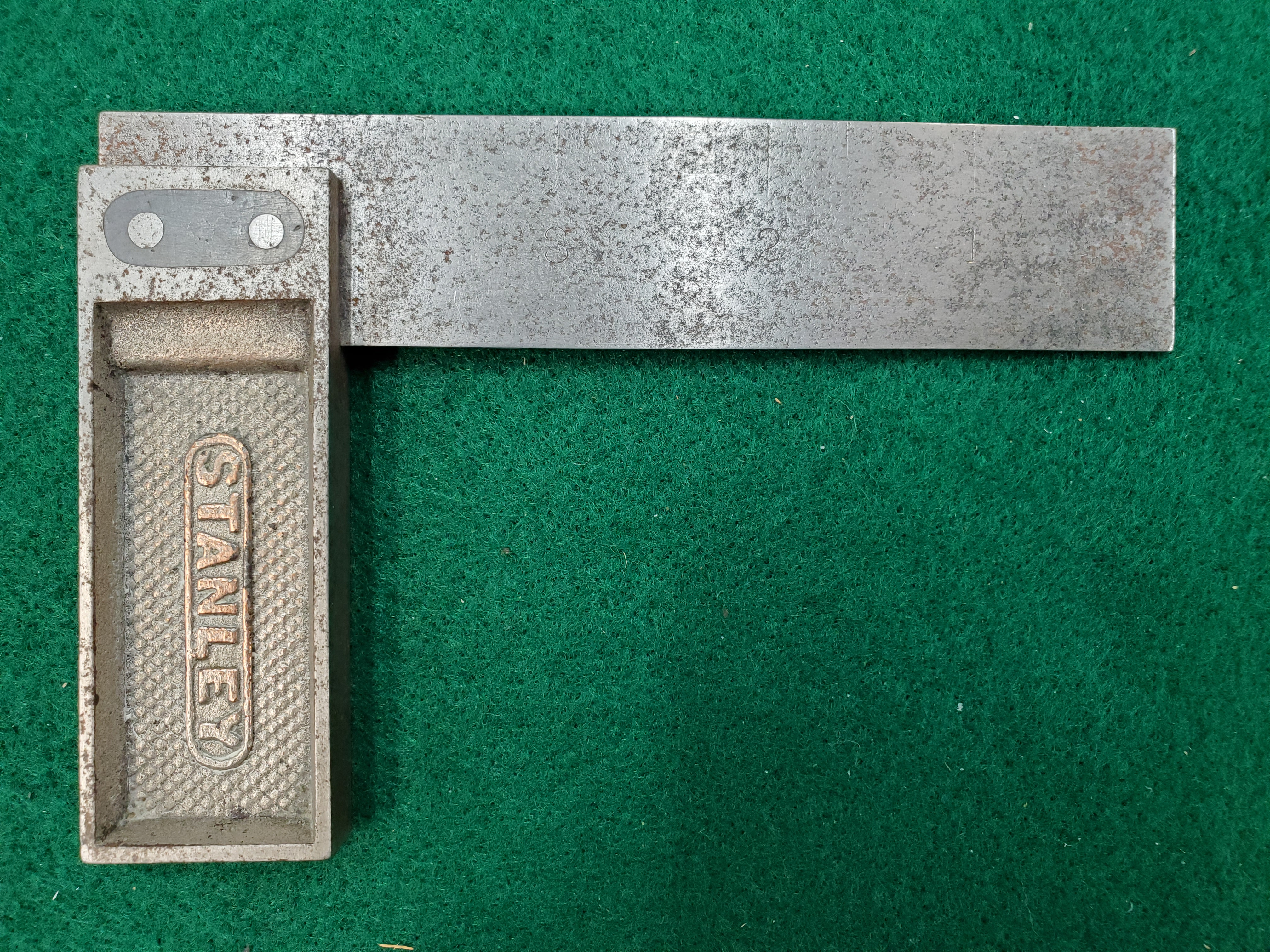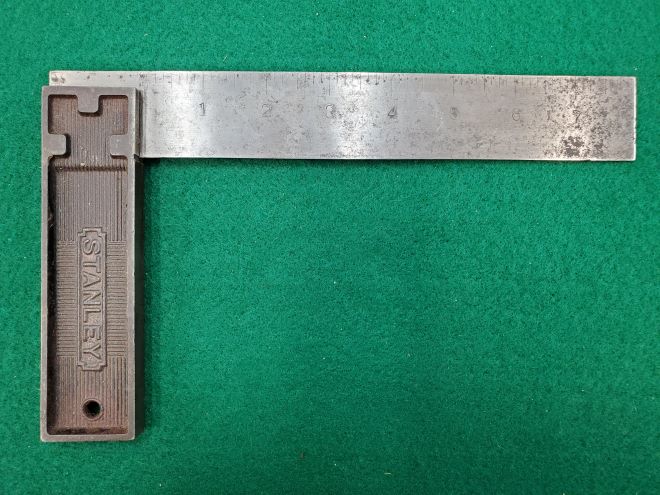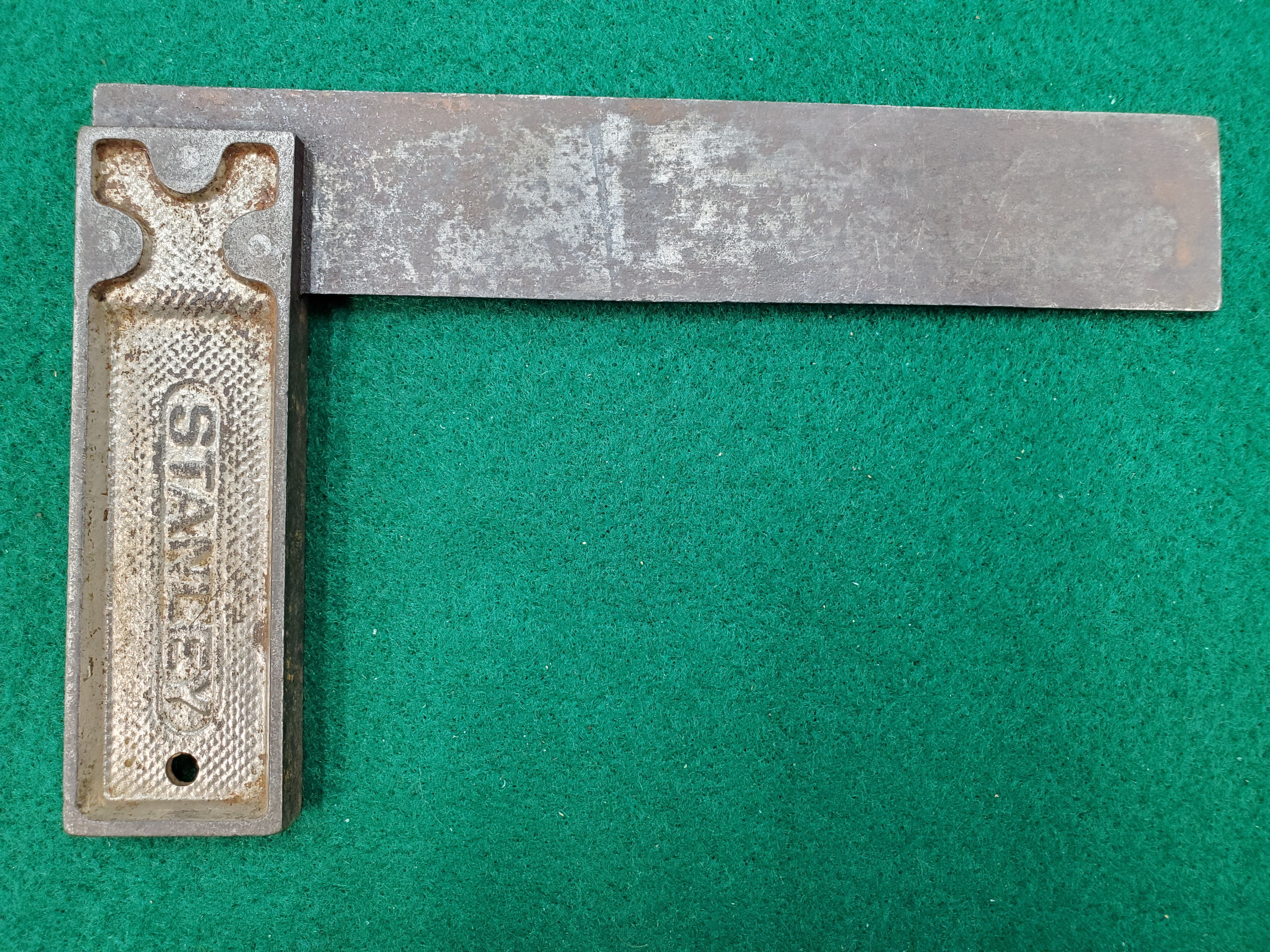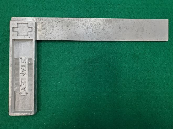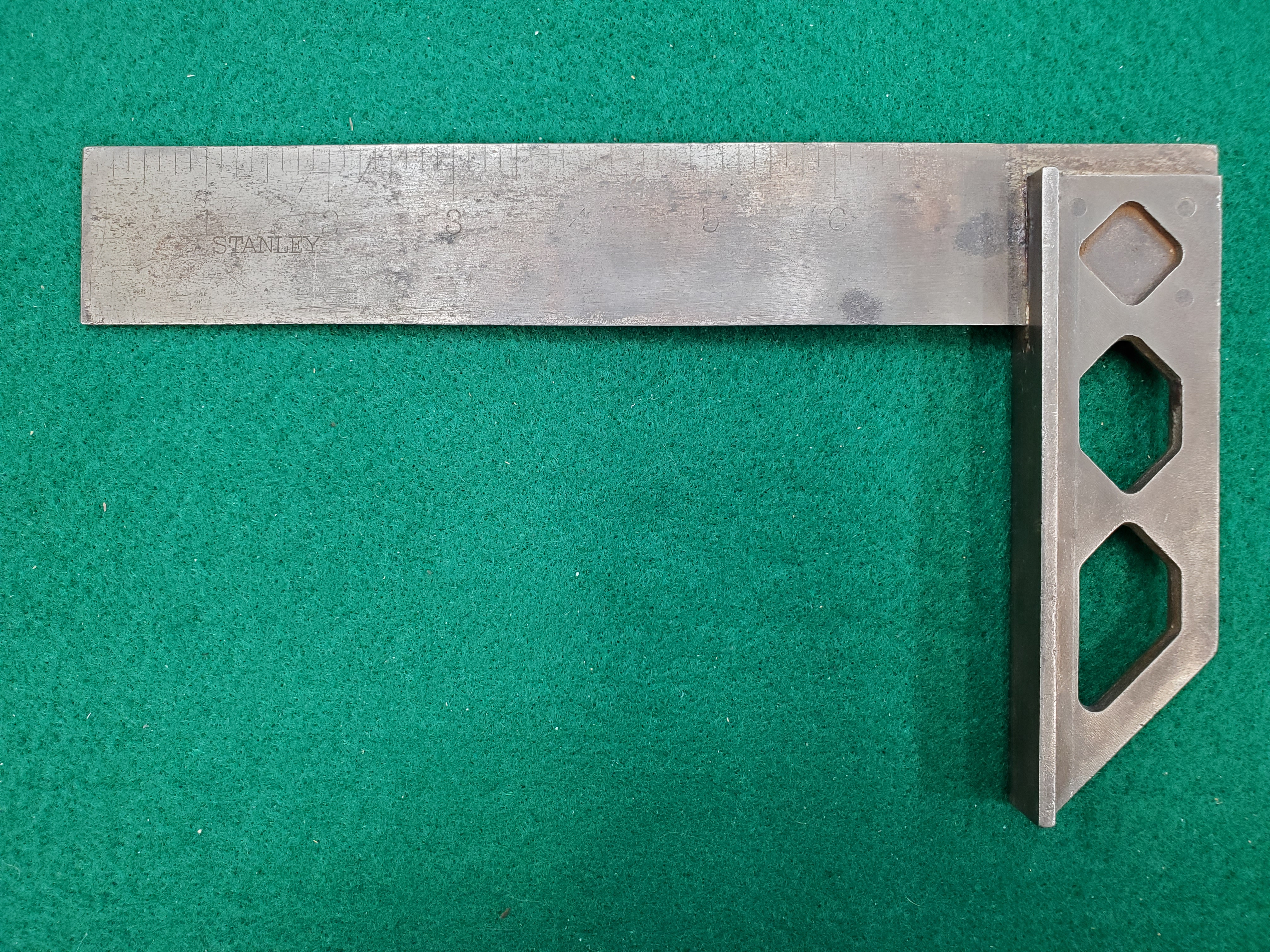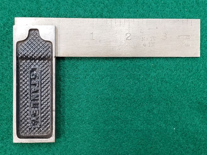 A complete redesign moves to an all metal handle, but it is still called the "Improved Try Square No 2". The blade is riveted to the handle and surrounded by lead, as detailed in Justus Traut’s May 26, 1874 patent. The Variation 1 features a black japanned handle and the patent date stamped into the lead surrounding the rivets. The patent date is many times unreadable though due to wear and abrasions in the soft lead. At some point Variation 2 was introduced which added Stanley in an oval cast into one side of the handle and the japanning replaced by nickel plating. In 1888 this model was permanently designated the No 12. (12", 10", 8", 6", 4", 2")
