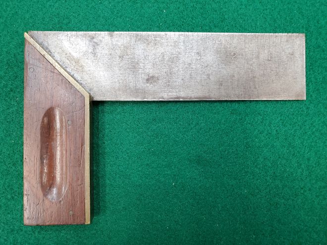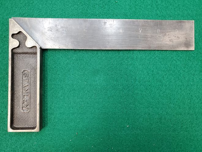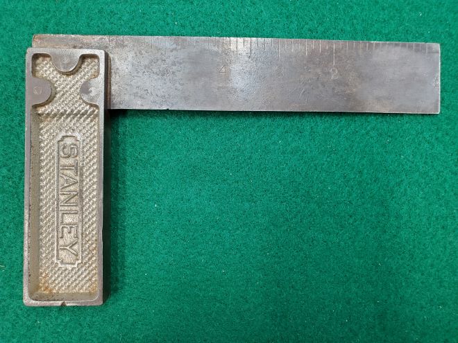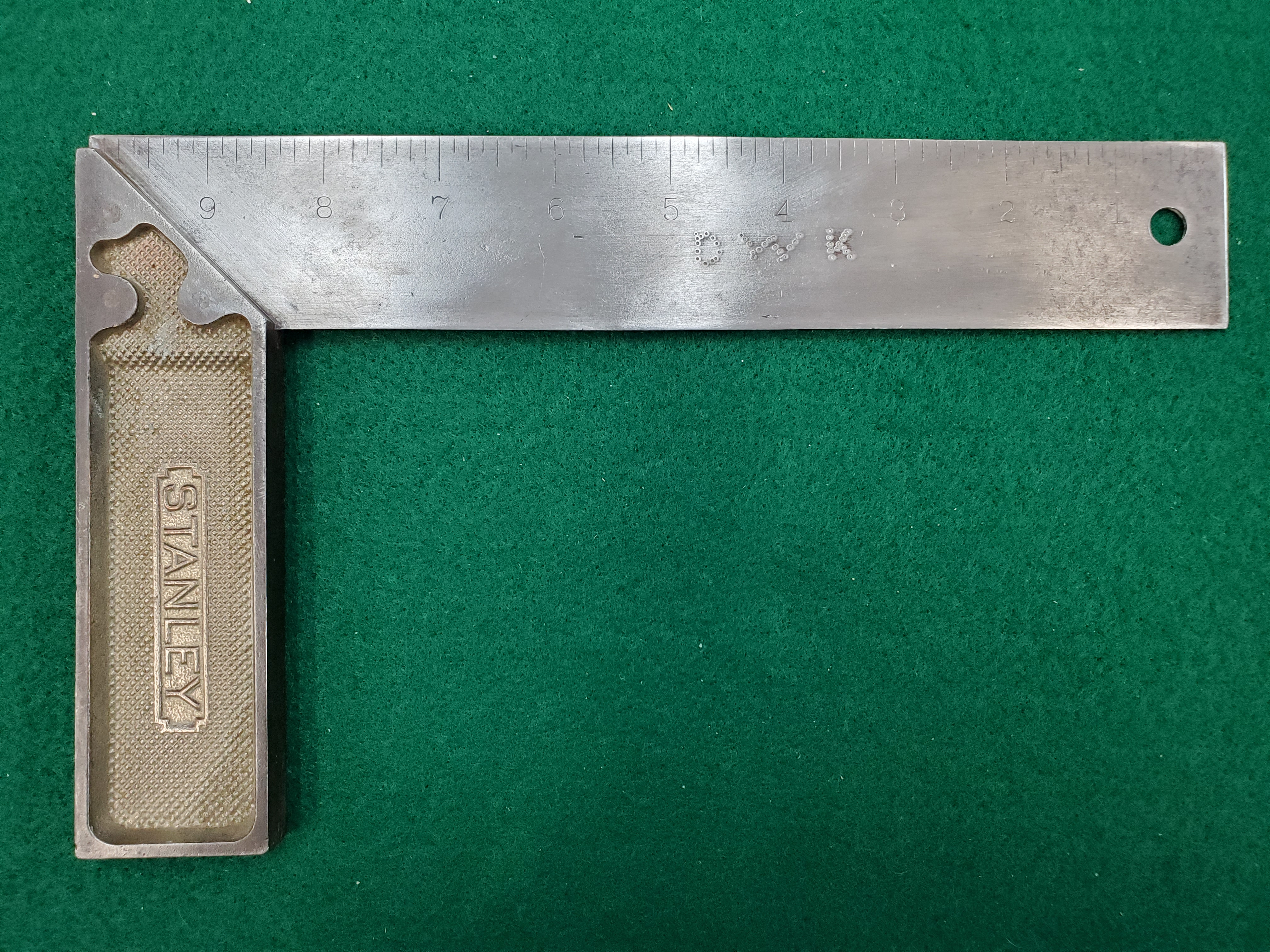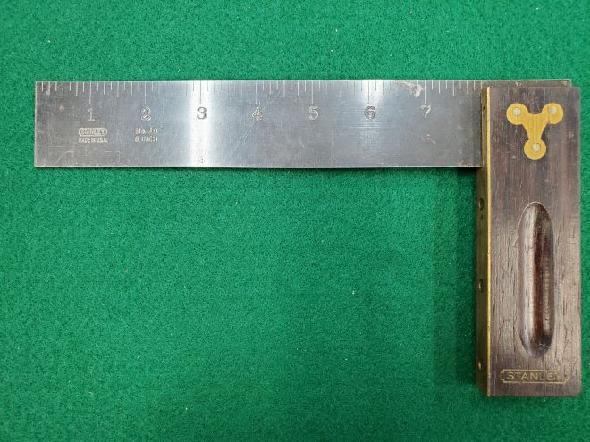 A complete redesign now featuring fastener free rosewood infill with the newly patented “Handy-Grip” grooves and a variety of different Stanley trademarks on the blade. Because none of the various design patents for the "Handy-Grip" feature specifically apply to this square, the patent is never stamped on the blade. (10", 8", 6", 4")