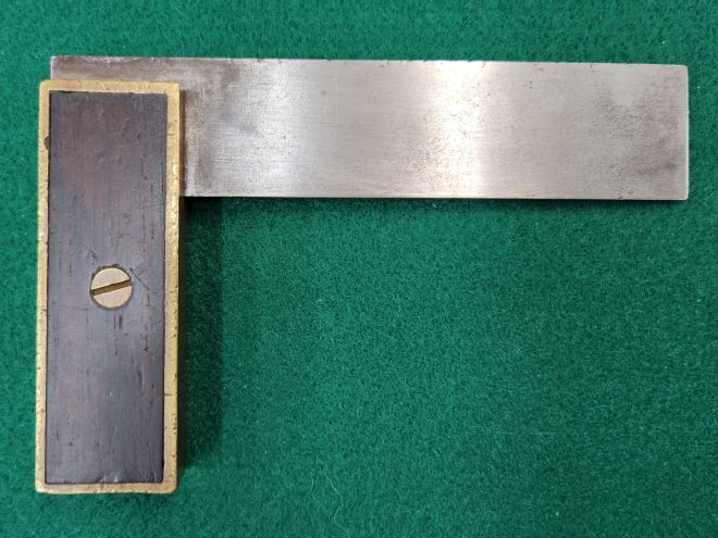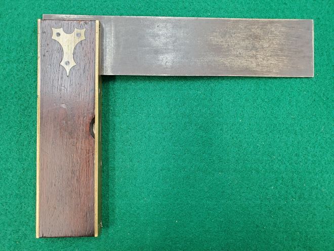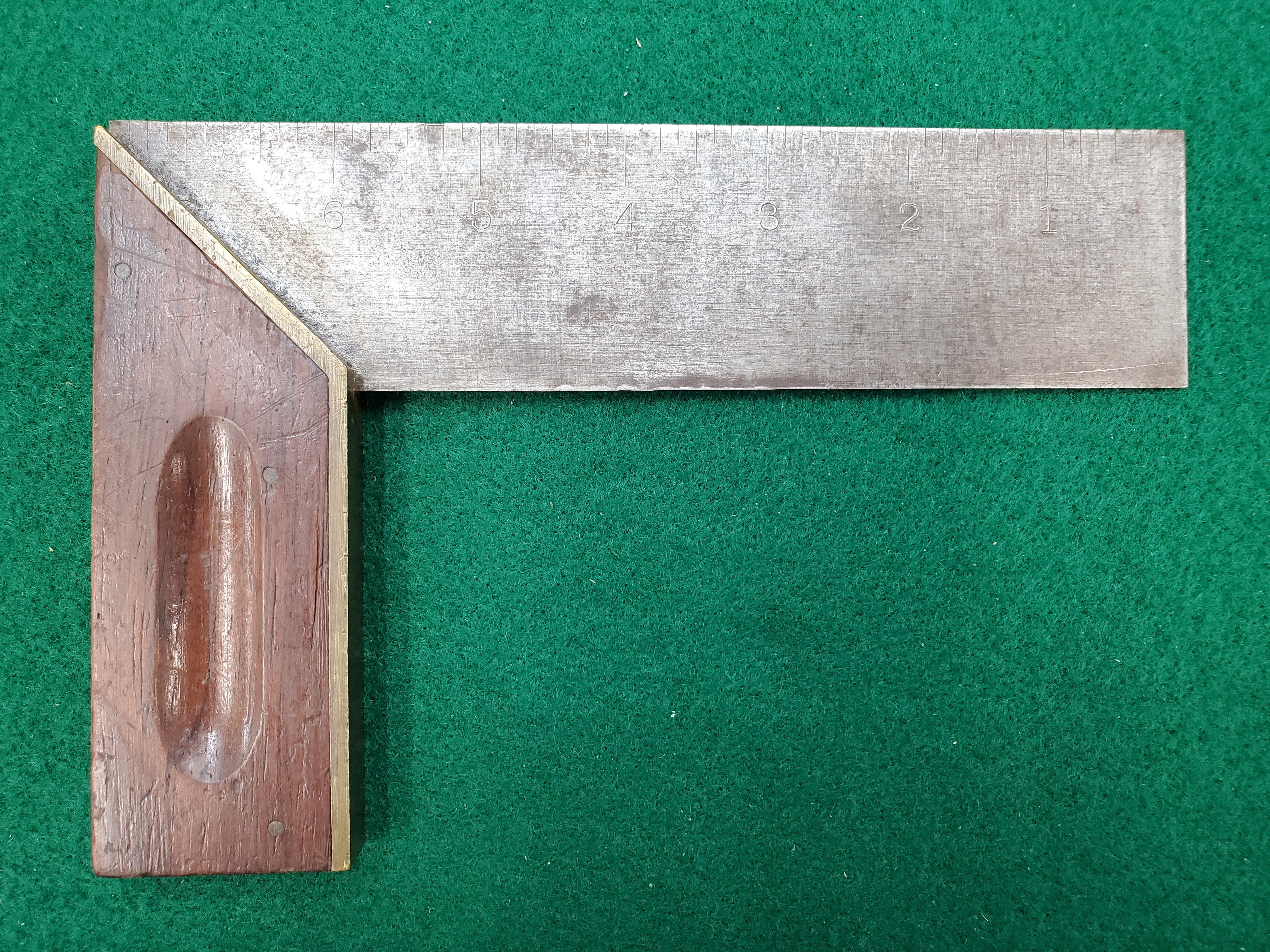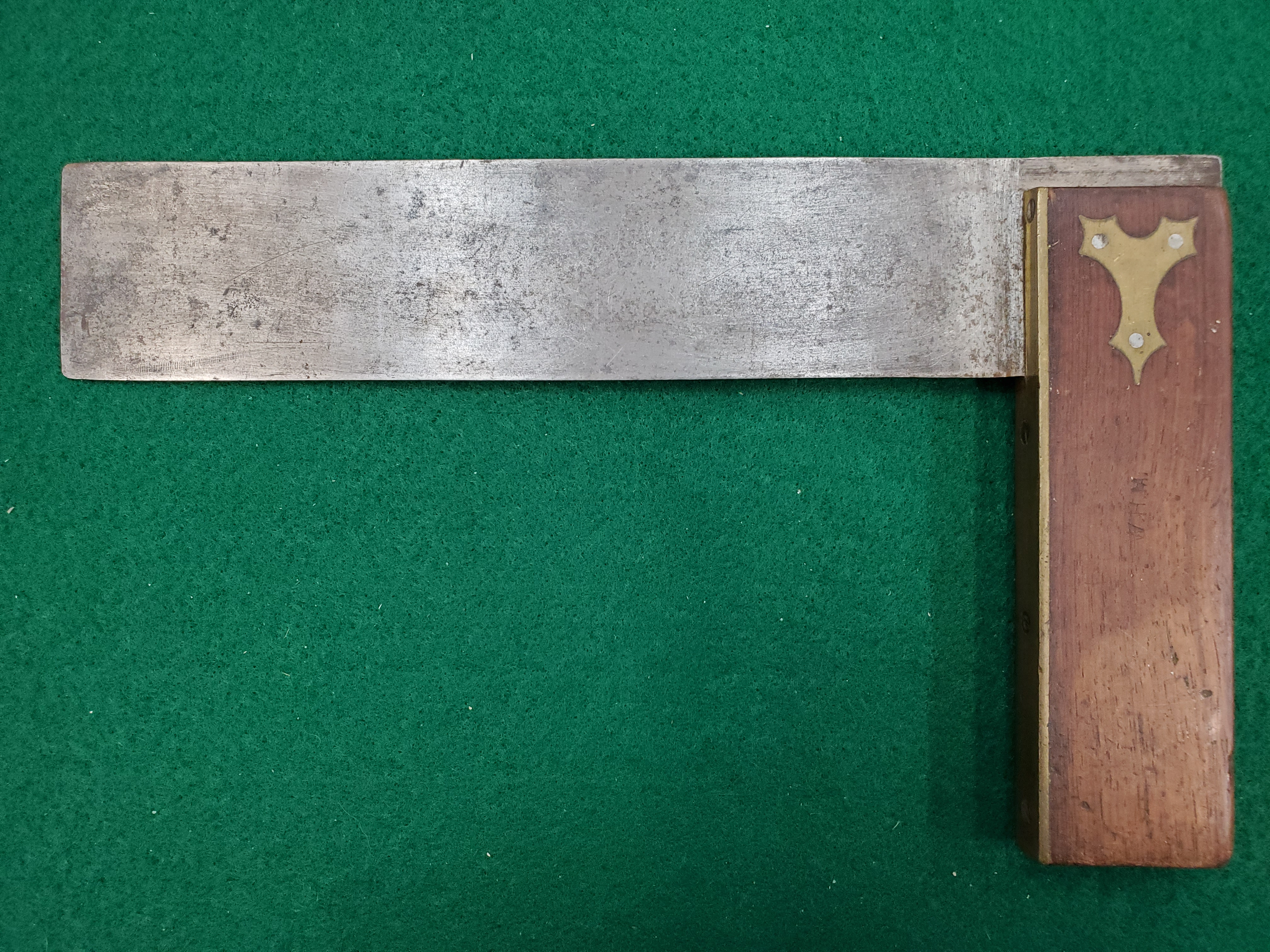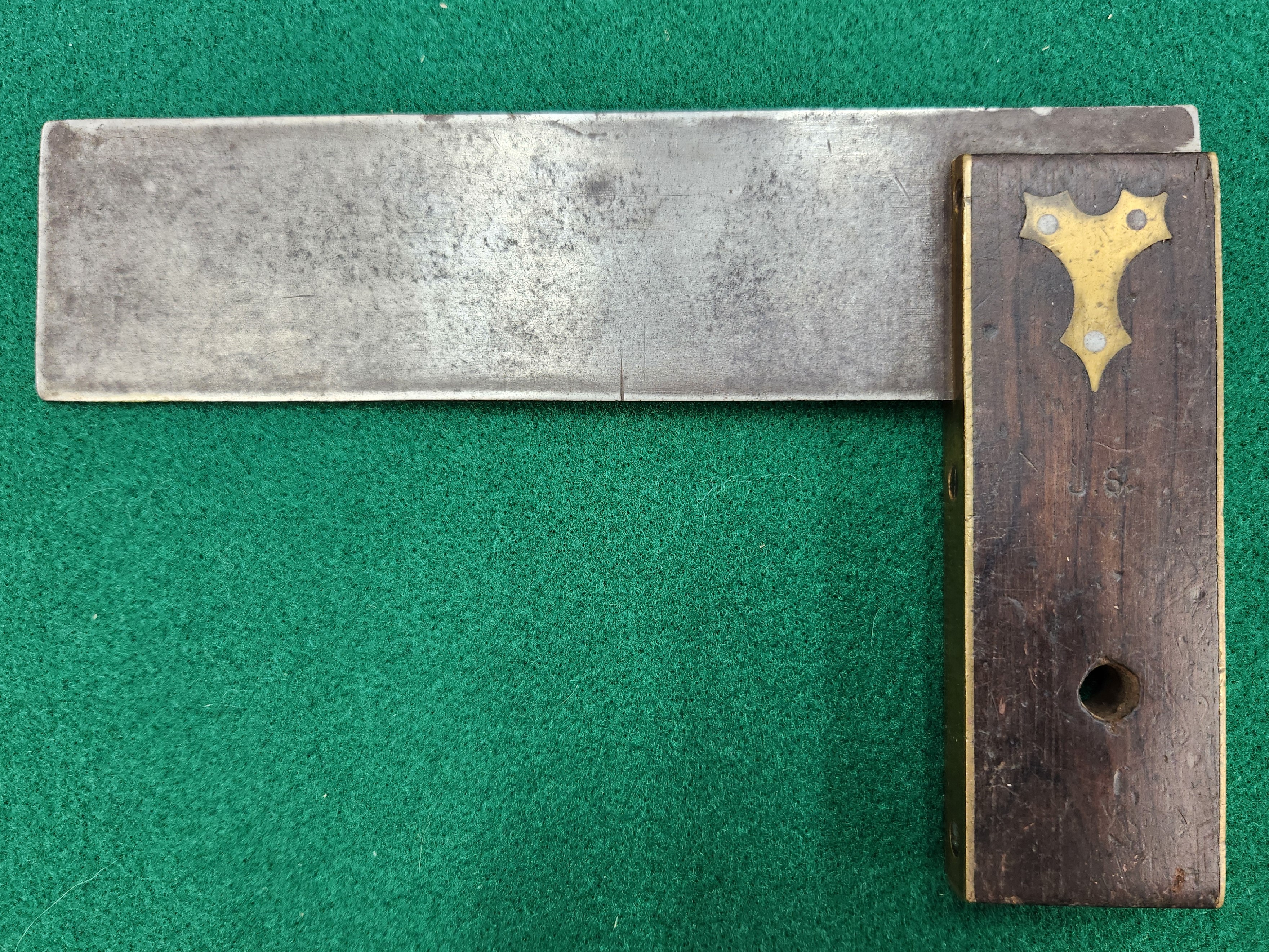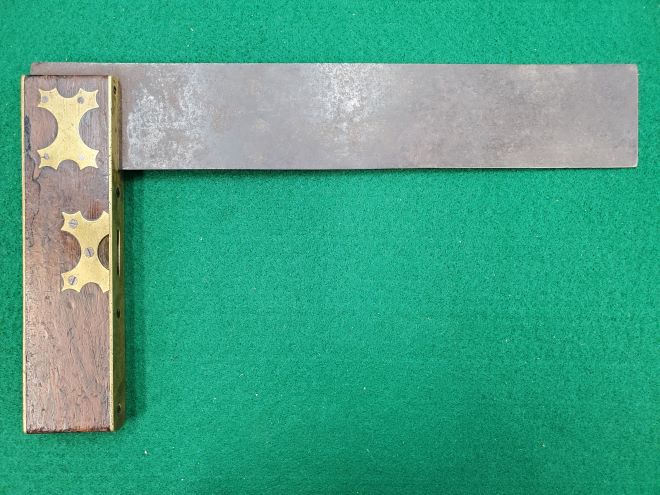 Called the "Improved Try Square No 1", this was likely introduced as competition to many other infill handle designs from other companies, and marketed as a sturdier alternative to traditional carpenters squares. This Type 1 uses a brass handle, was likely offered for a very short time, and is extremely rare. Anywhere from 1 to 4 screws (depending on handle size) pass through holes in the handle and screw into the other infill, essentially clamping the two thin pieces of rosewood onto the handle. The blade features the arched “beehive” Stanley mark. The mark can be located almost anywhere along the blade and is frequently a very poor stamp, making it many times hard to find. (12", 10", 9", 8", 6", 4", 3")