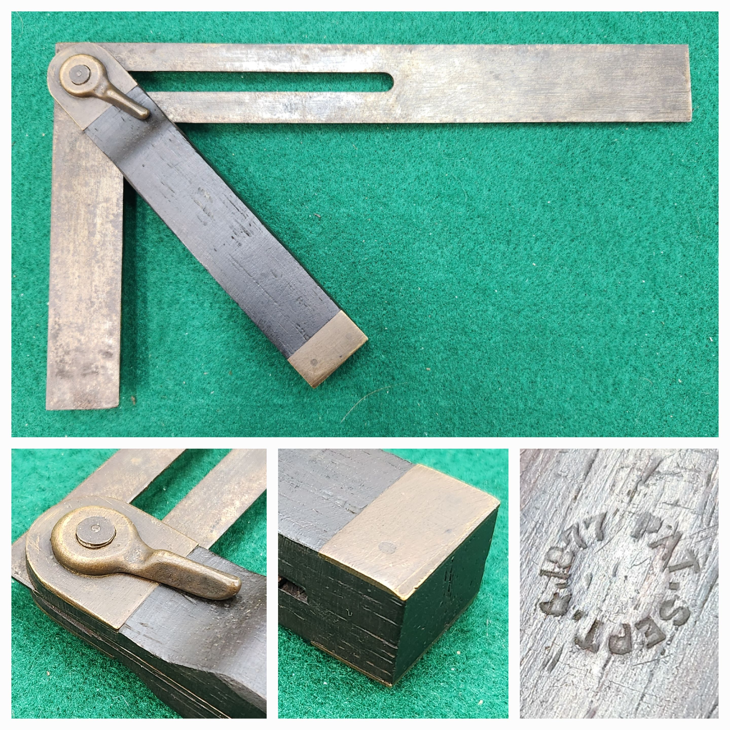 Stanley's "Patent Improved Sliding T Bevel" patented by Justus Traut on May 9, 1871. This was Stanley's very first metal handled bevel and was only offered in the 1871 insert and 1872 catalog. It is a very clever design, with an integrated rest that allows the fully extended bevel to stay placed on the edge of a board. The rest's usefulness is somewhat limited though by the fact that the blade must be fully extended and not more than 35 degrees or so from 90 for it to balance correctly. (10", 8", 6")