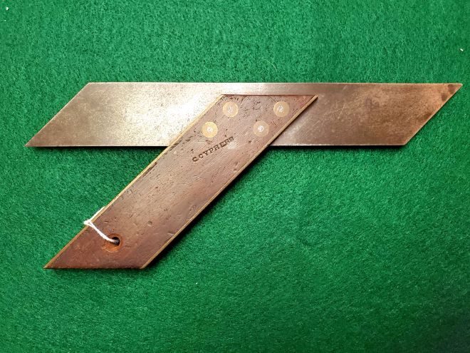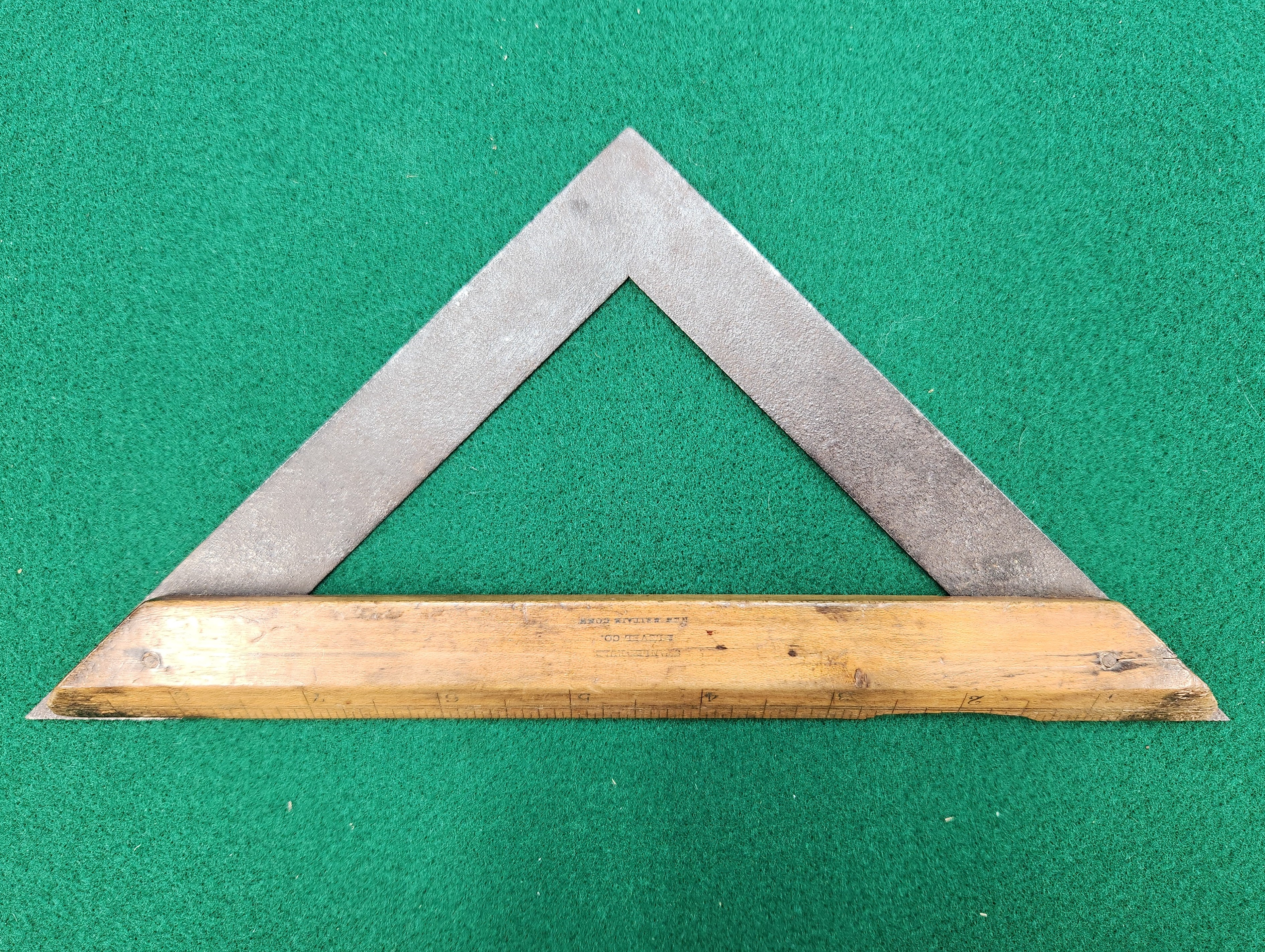 Offered only in 1870 and never assigned a model number, Stanley’s “Triangular Miter” featured a steel triangle with a beveled wood base marked with graduations. Examples show up very infrequently at auction and command high prices. (9")