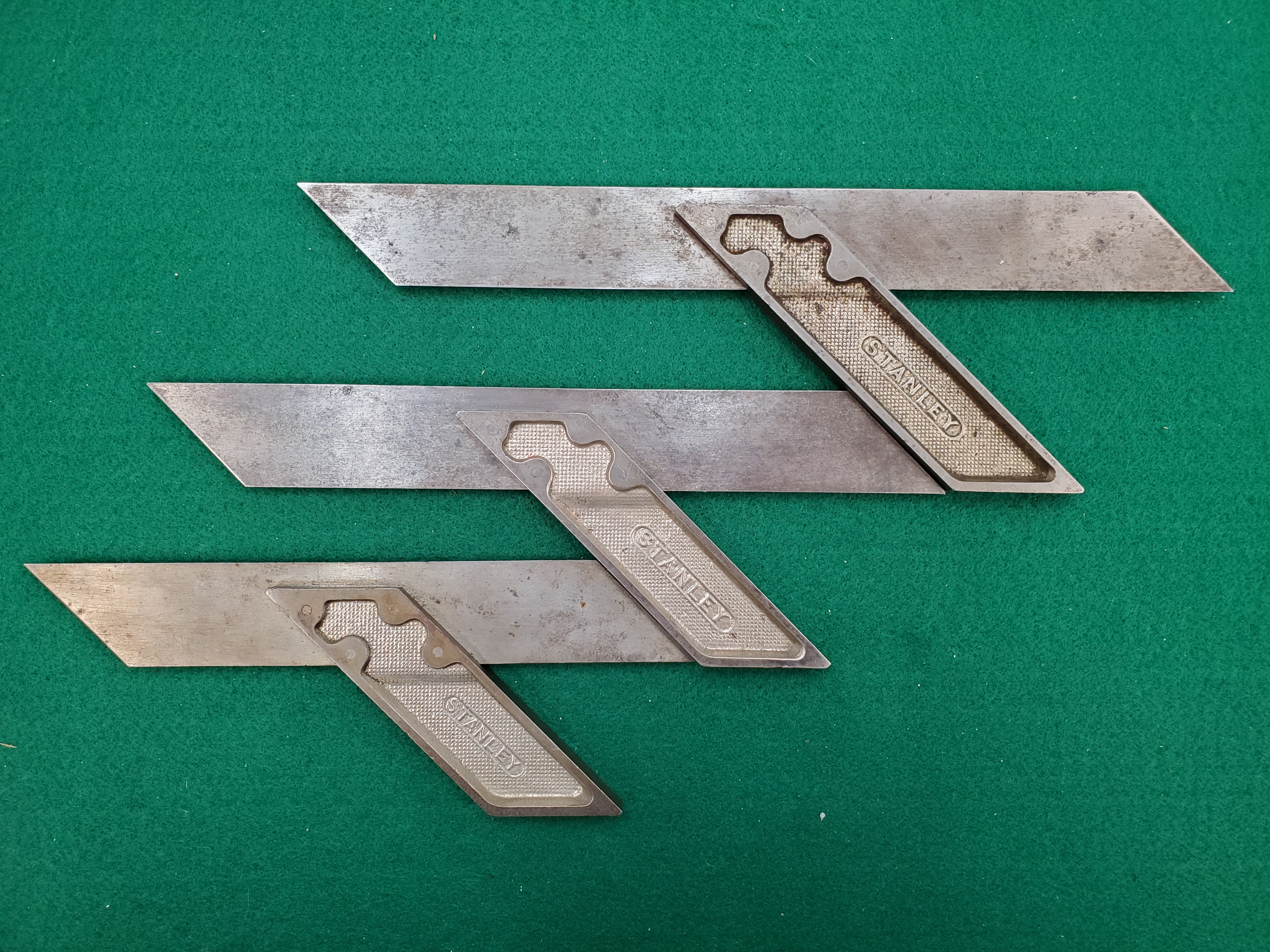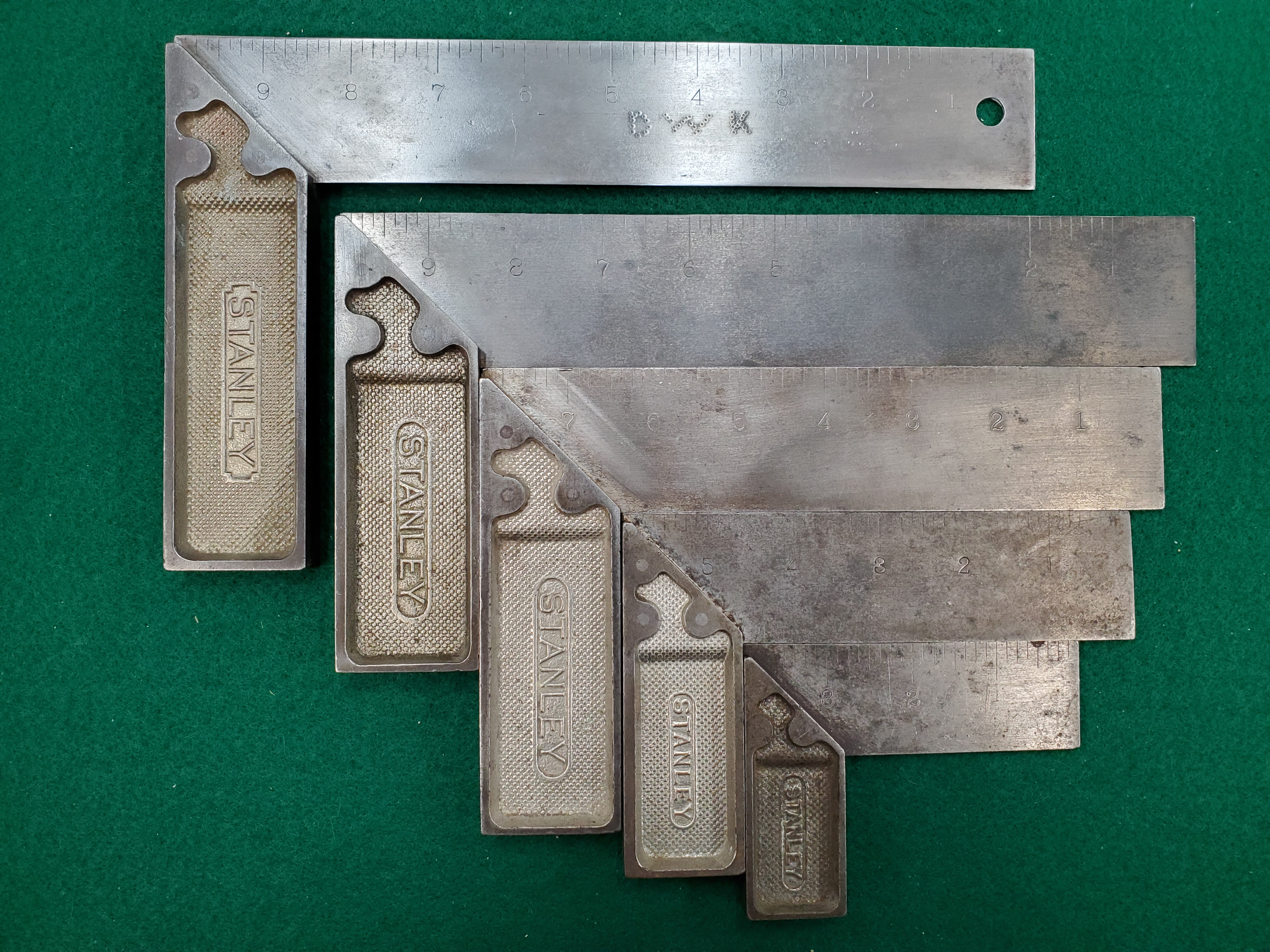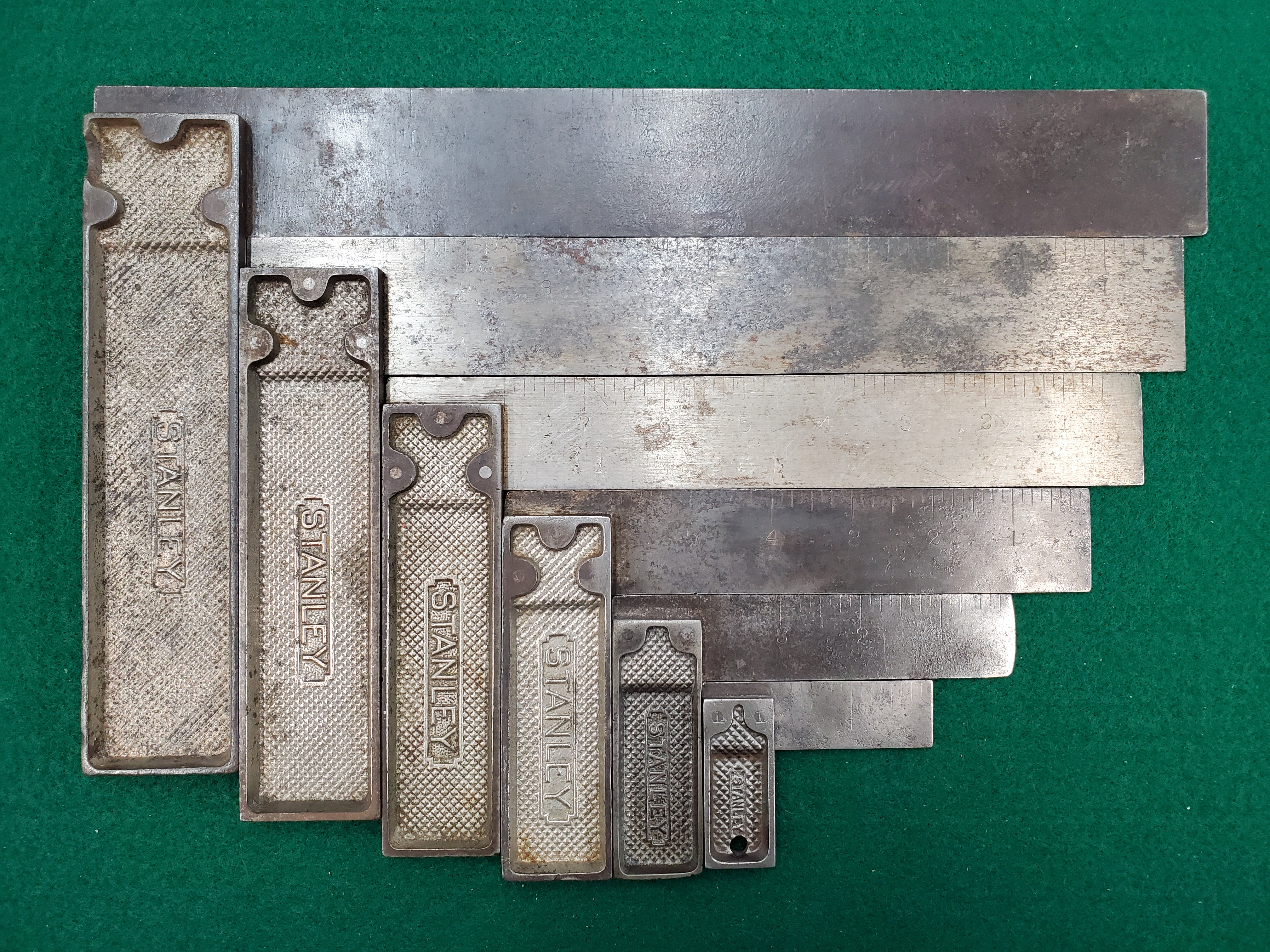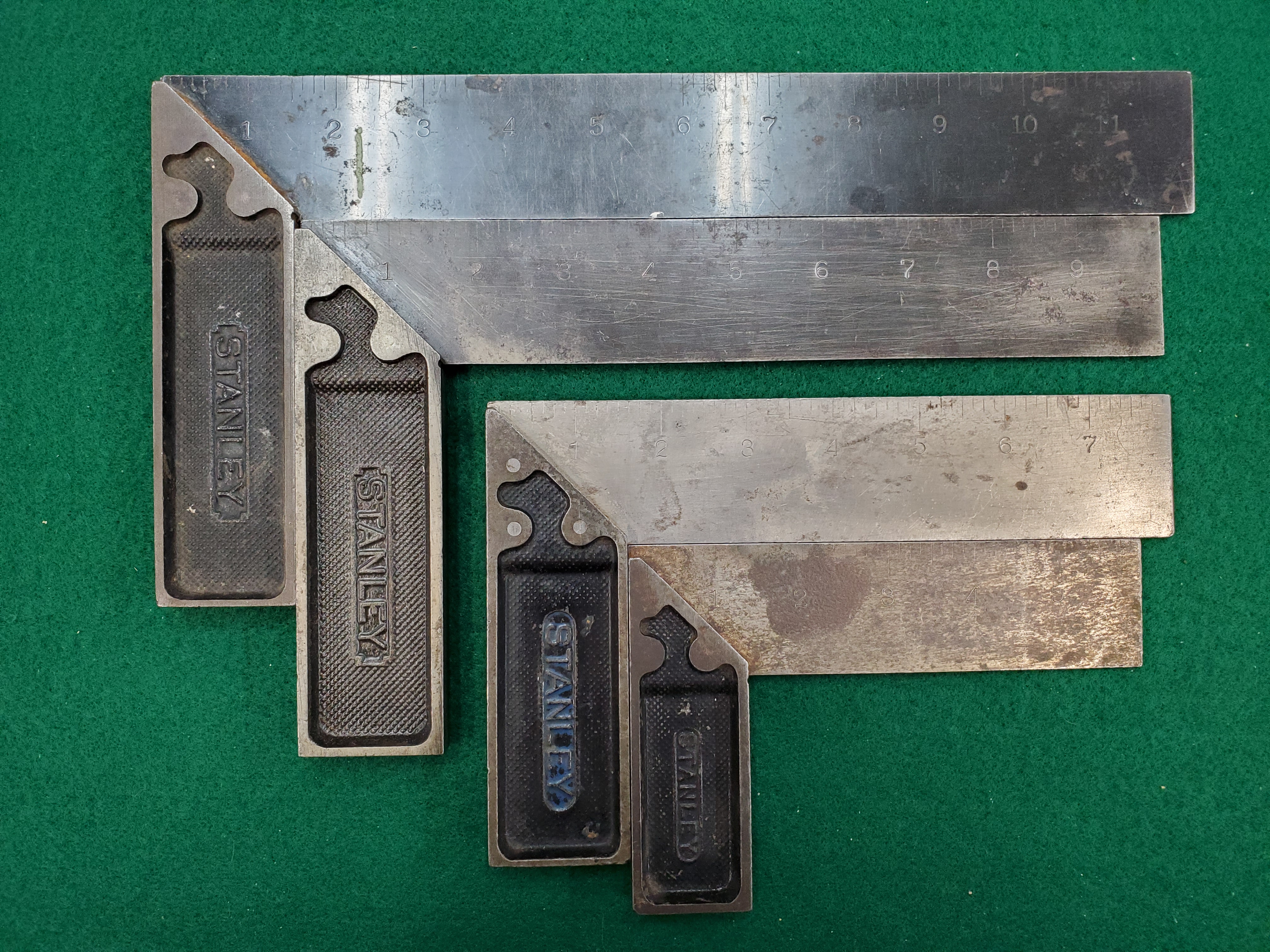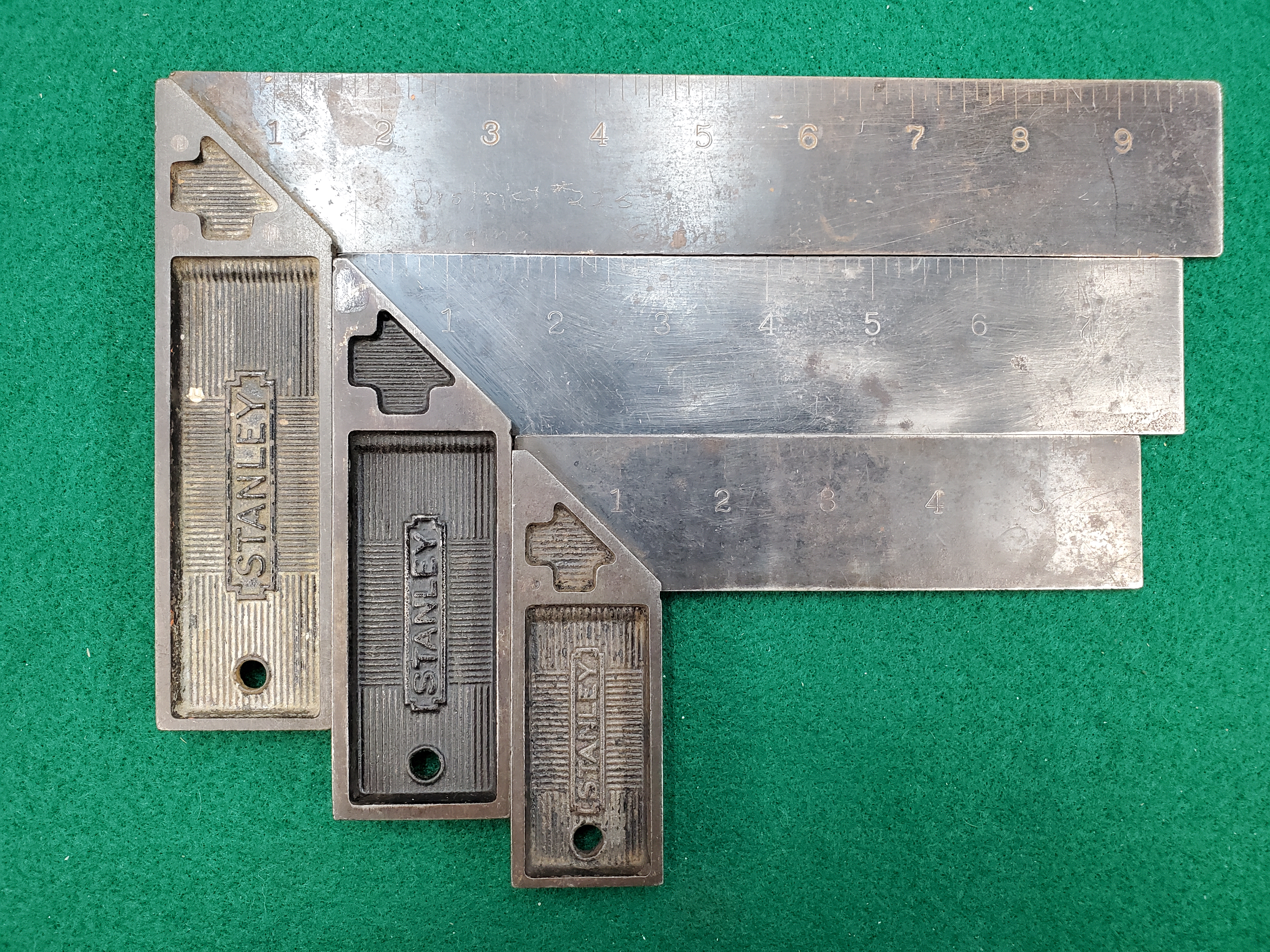 This page shows basic type studies for all of bevels and fixed try and miter squares offered by Stanley from 1858 through the 1950s. A representative square or bevel is shown for each type and variation, but group photos of multiple sizes are also provided. Be sure to view these extra photos since sometimes details change with the size of the squares. Also of note is that Stanley did not assign unique model numbers to squares and bevels until the 1888 catalog. Prior to that date, products were referred to by a name and the No 1 or No 2 designation was used to distinguish between higher and lower priced versions of the same product.