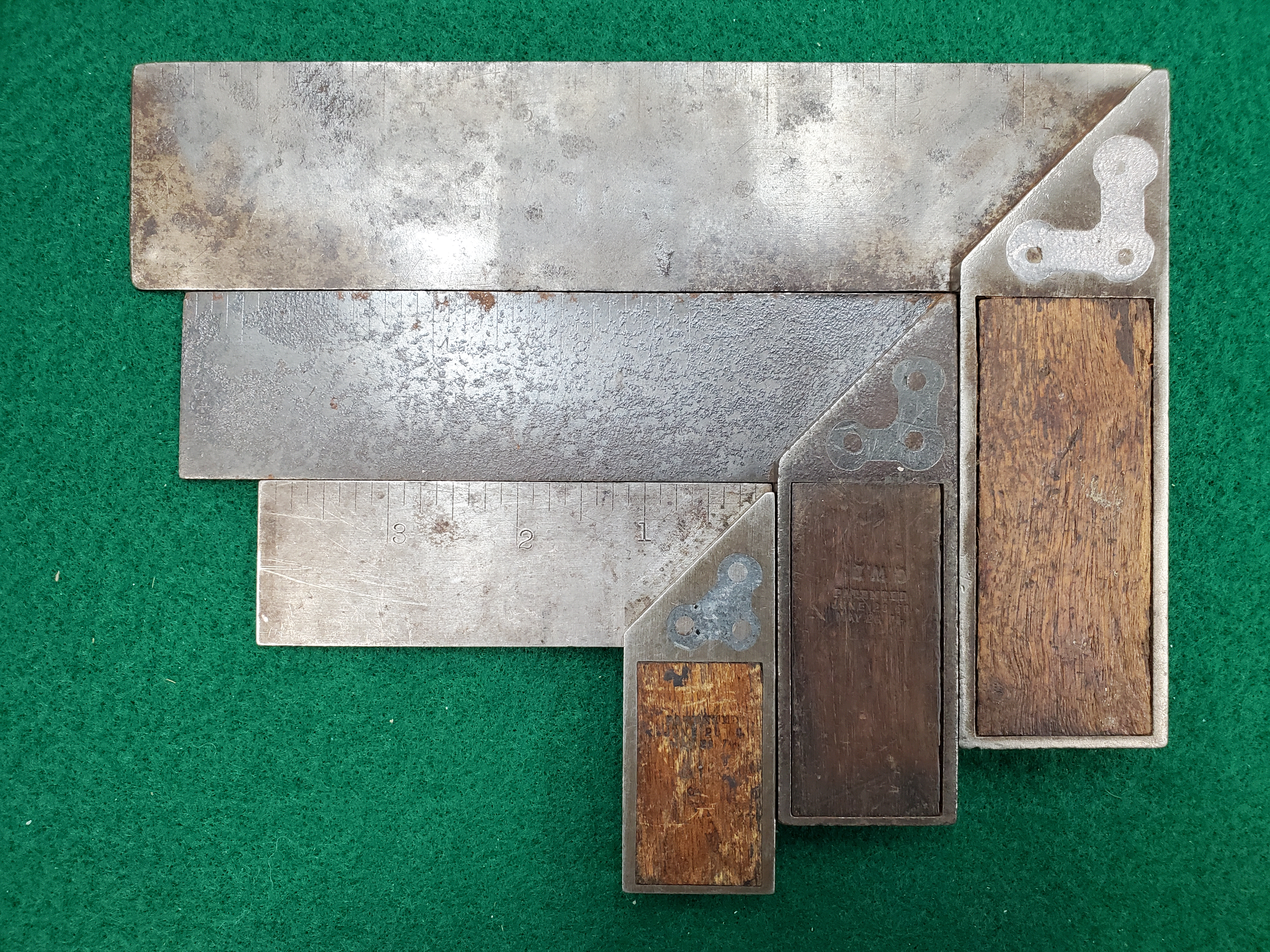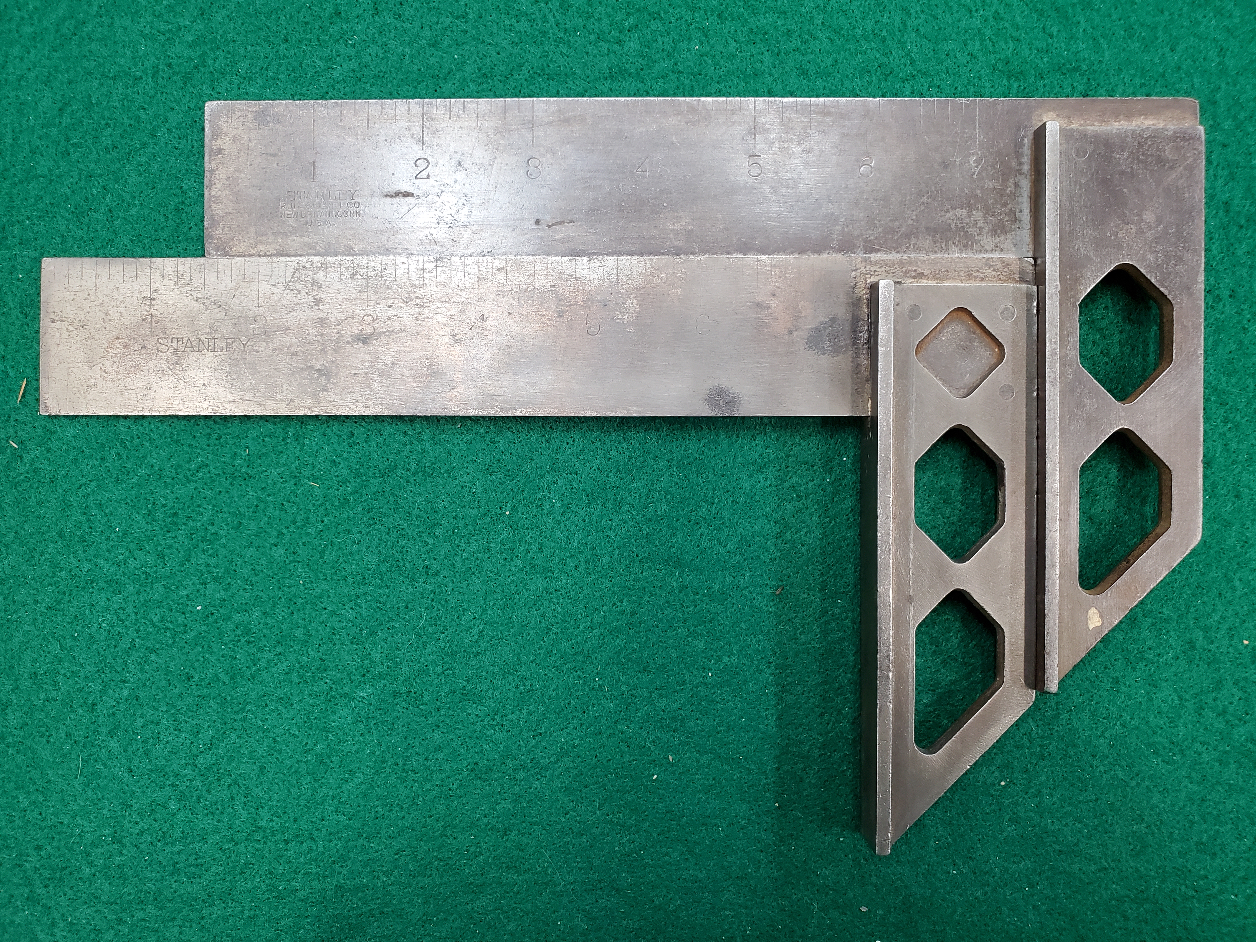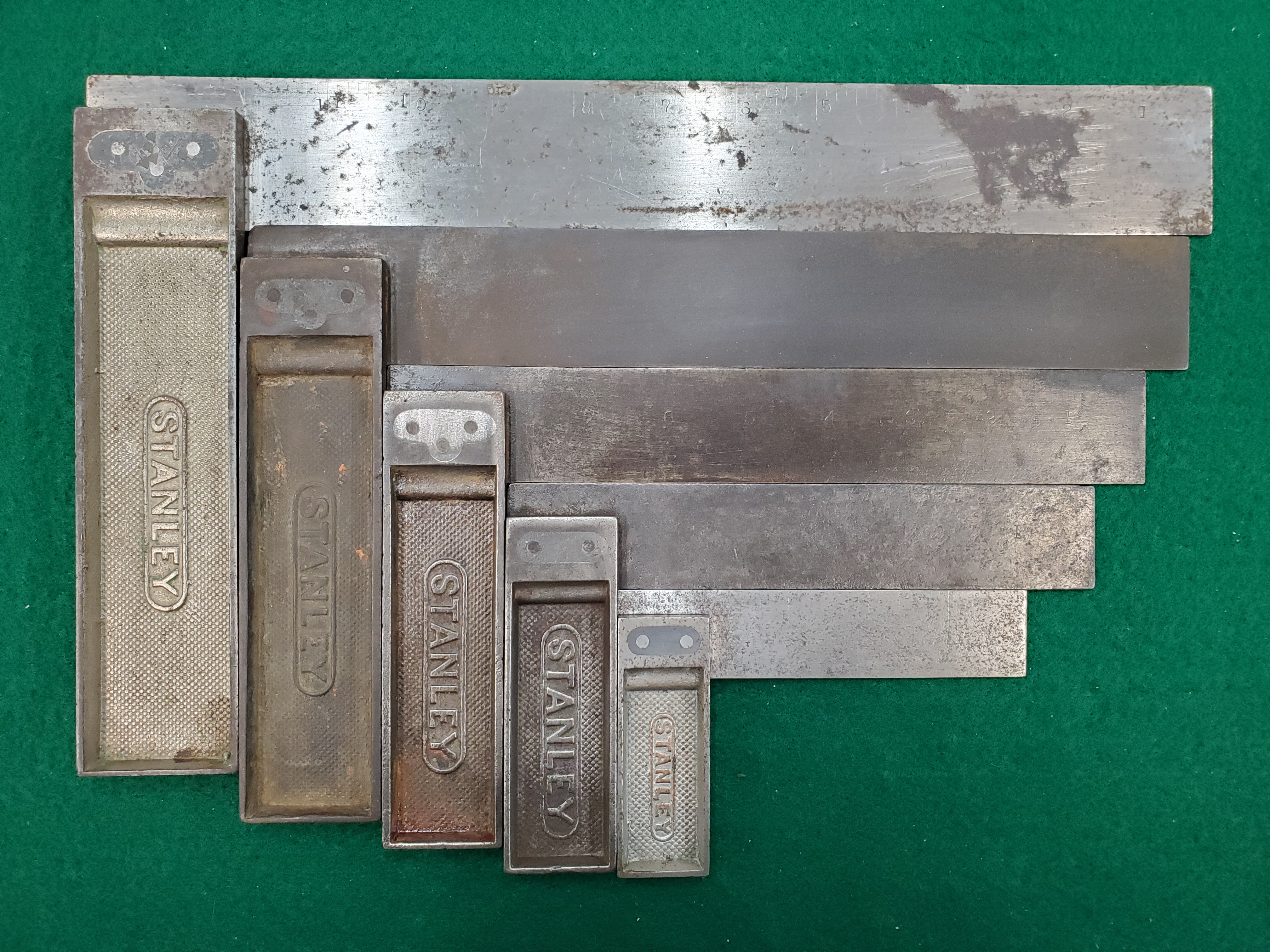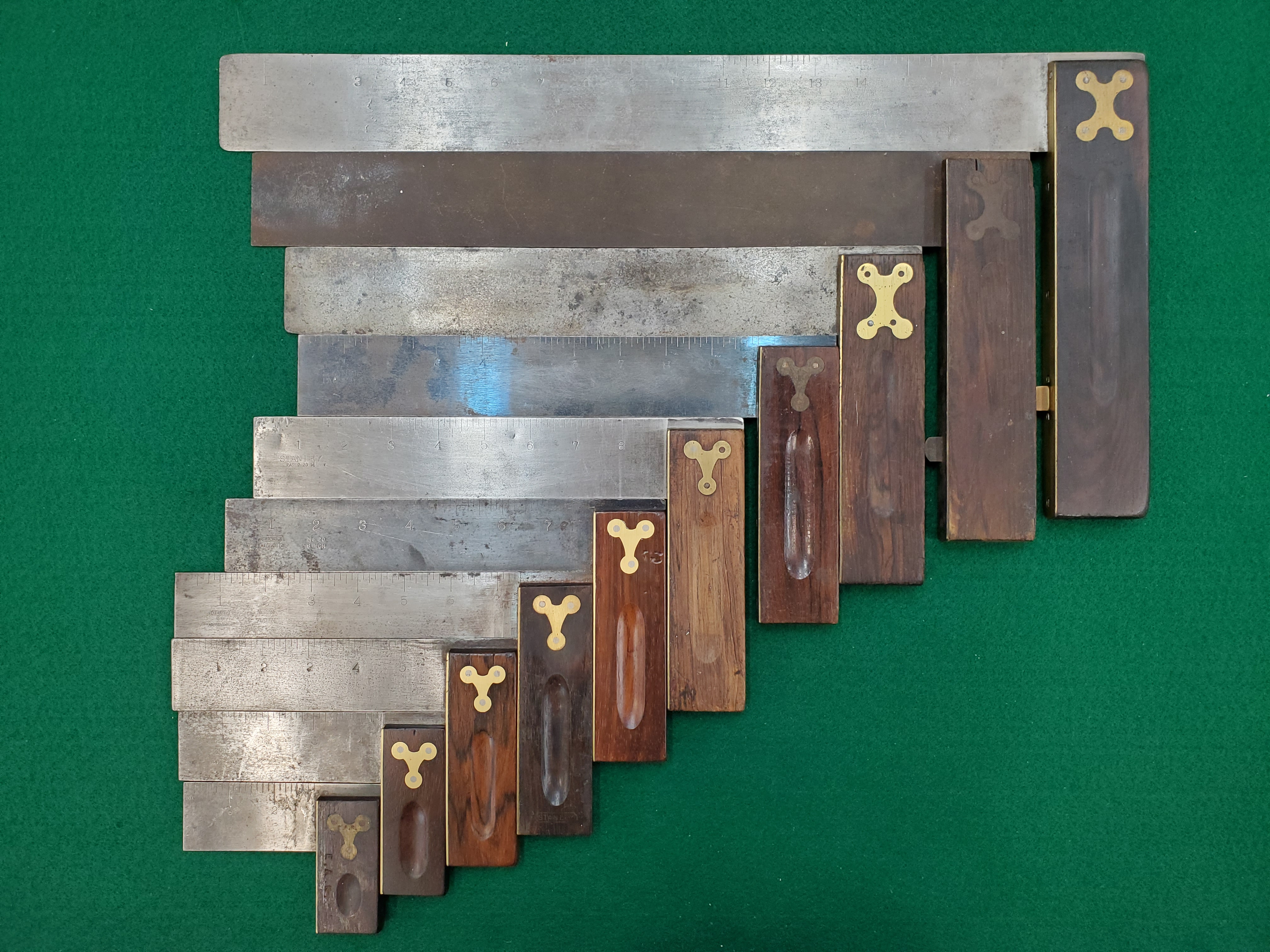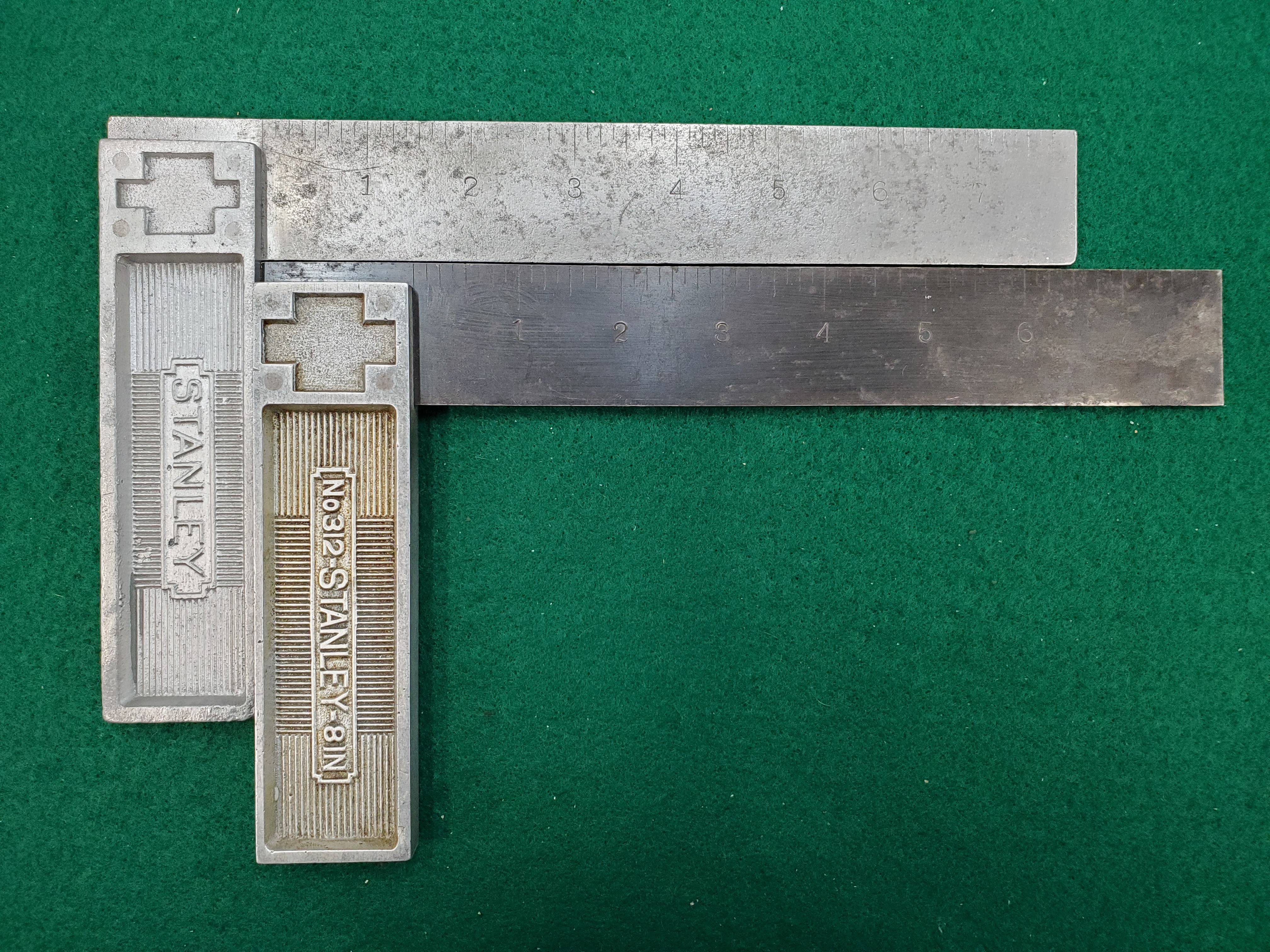 This page shows basic type studies for all of bevels and fixed try and miter squares offered by Stanley from 1858 through the 1950s. A representative square or bevel is shown for each type and variation, but group photos of multiple sizes are also provided. Be sure to view these extra photos since sometimes details change with the size of the squares. Also of note is that Stanley did not assign unique model numbers to squares and bevels until the 1888 catalog. Prior to that date, products were referred to by a name and the No 1 or No 2 designation was used to distinguish between higher and lower priced versions of the same product.