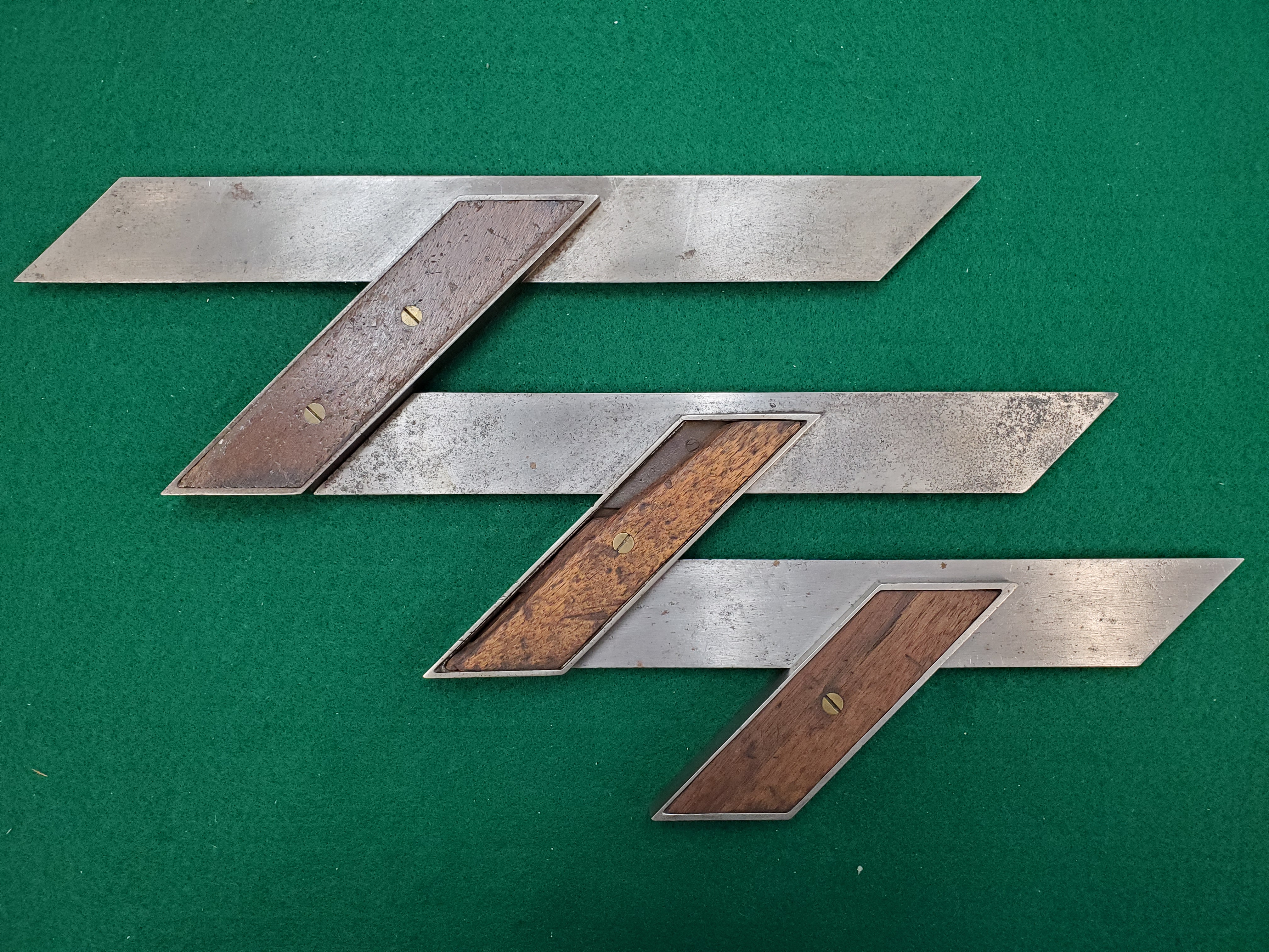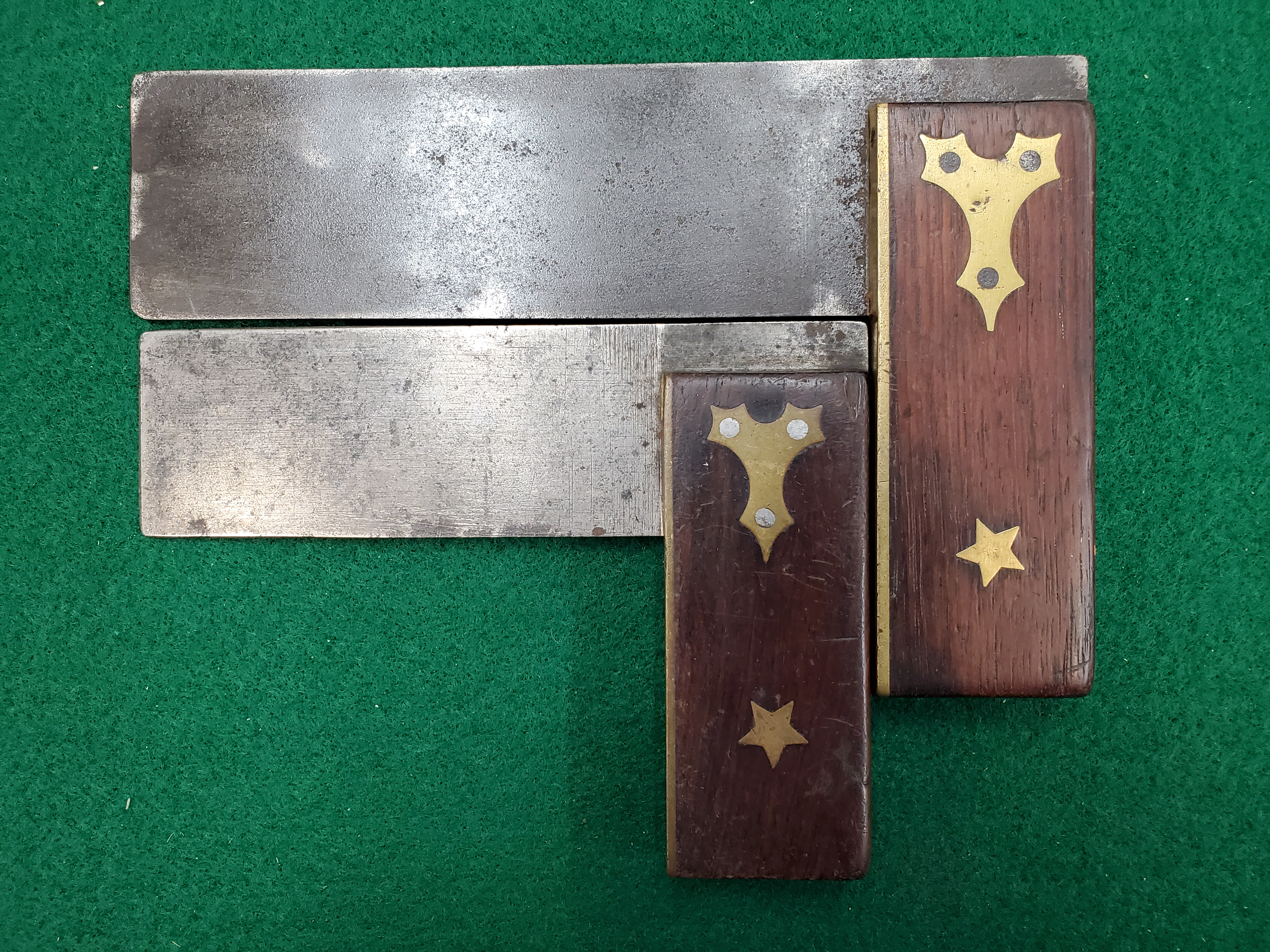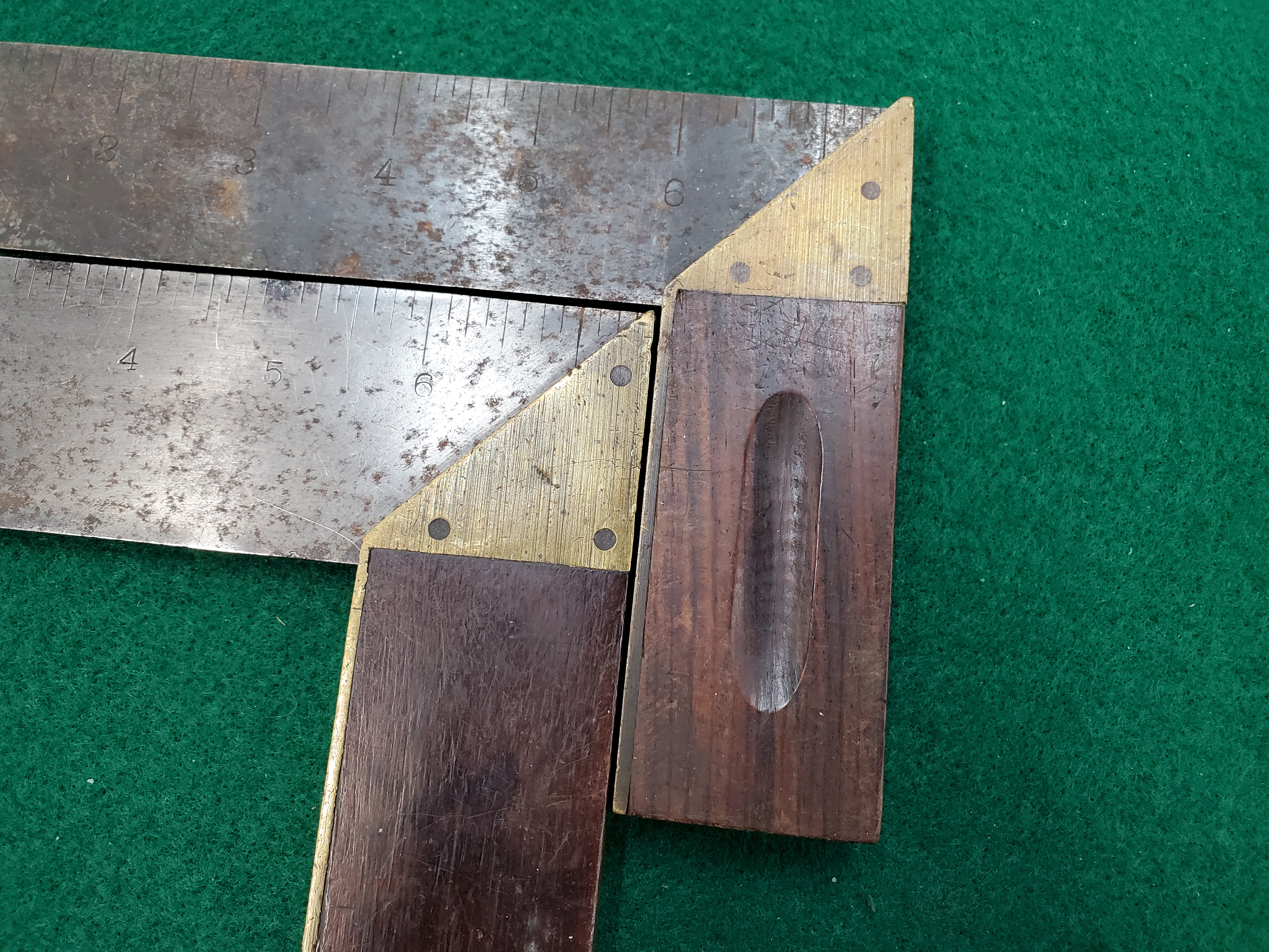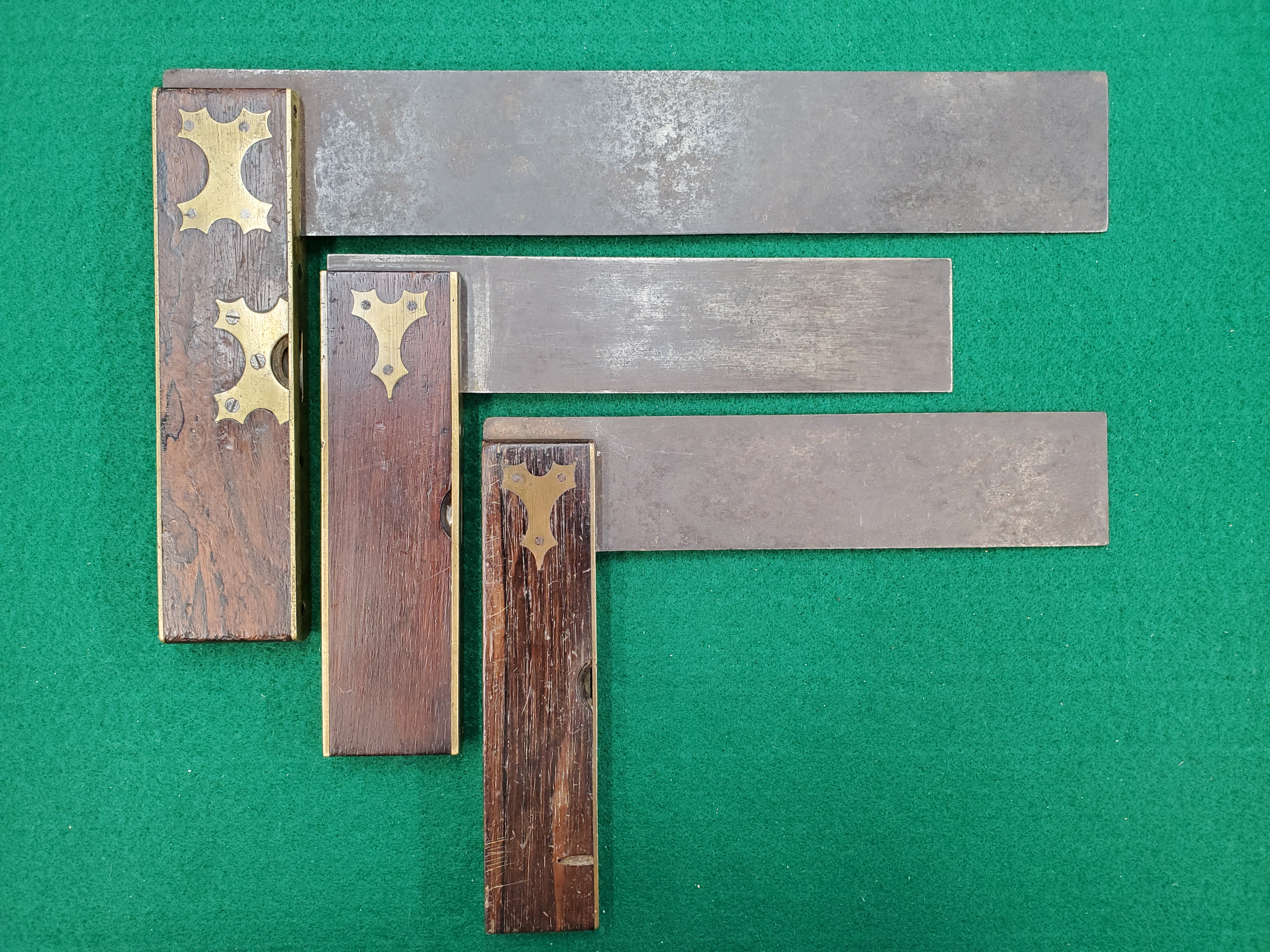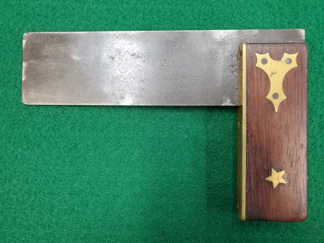 All three variations were at one point offered at the same time. They represent different features and price points. None are marked. Variation 1 was called "Best Plated Try Square No 1" and features a beefier handle, thicker brass face plate, better steel, and most obviously, a star inset into the handle. These are quite uncommon. Variation 2 was called "Plated Try Square No 2" and is the “normal” square that would have been bought by the masses. These are quite common. Variation 3 was called "Plated Try Square, Brass Back" and is identical to variation 2 except for the addition of a brass back plate along the back edge of the handle. The author has only ever seen the one pictured here. A more complete Type Study for the No 20 is available. (18", 15", 12", 10", 9", 7.5", 6", 4.5", 3")