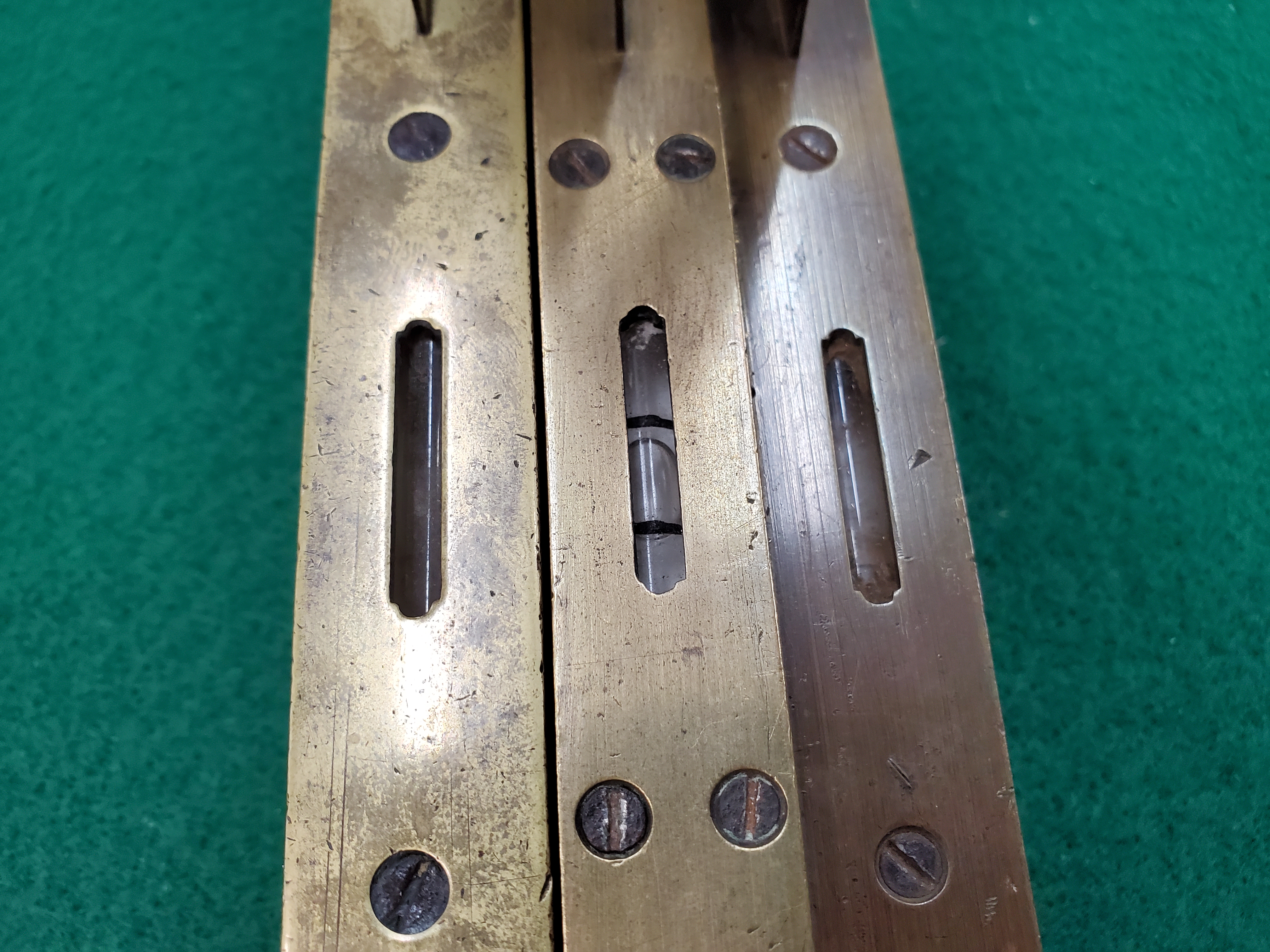 The No 22 squares feature levels in the handle. They can be spotted by the crescent shaped level side view ports and a narrow viewing slot in the face plate. All three variations were at one point offered at the same time. They represent different features and price points. Variations 1 & 2 were called the "Plumb and Level Try Square No 1". Variation 3 was called the "Plumb and Level Try Square No 2". None are marked. All three feature longer handles than would normally be found on No 20 squares of the same blade length. Variation 1 was only available with a 12” blade and feature back plating and an extra escutcheon protecting and decorating the side view of the level vial. Variation 2 was only offered in a 7.5” length and featured back plating. Variation 3 was essentially a normal No 20 square with an elongated handle and added level. All three are very difficult to find. Variation 1 was the most expensive square or bevel ever offered by Stanley. (12", 7.5")