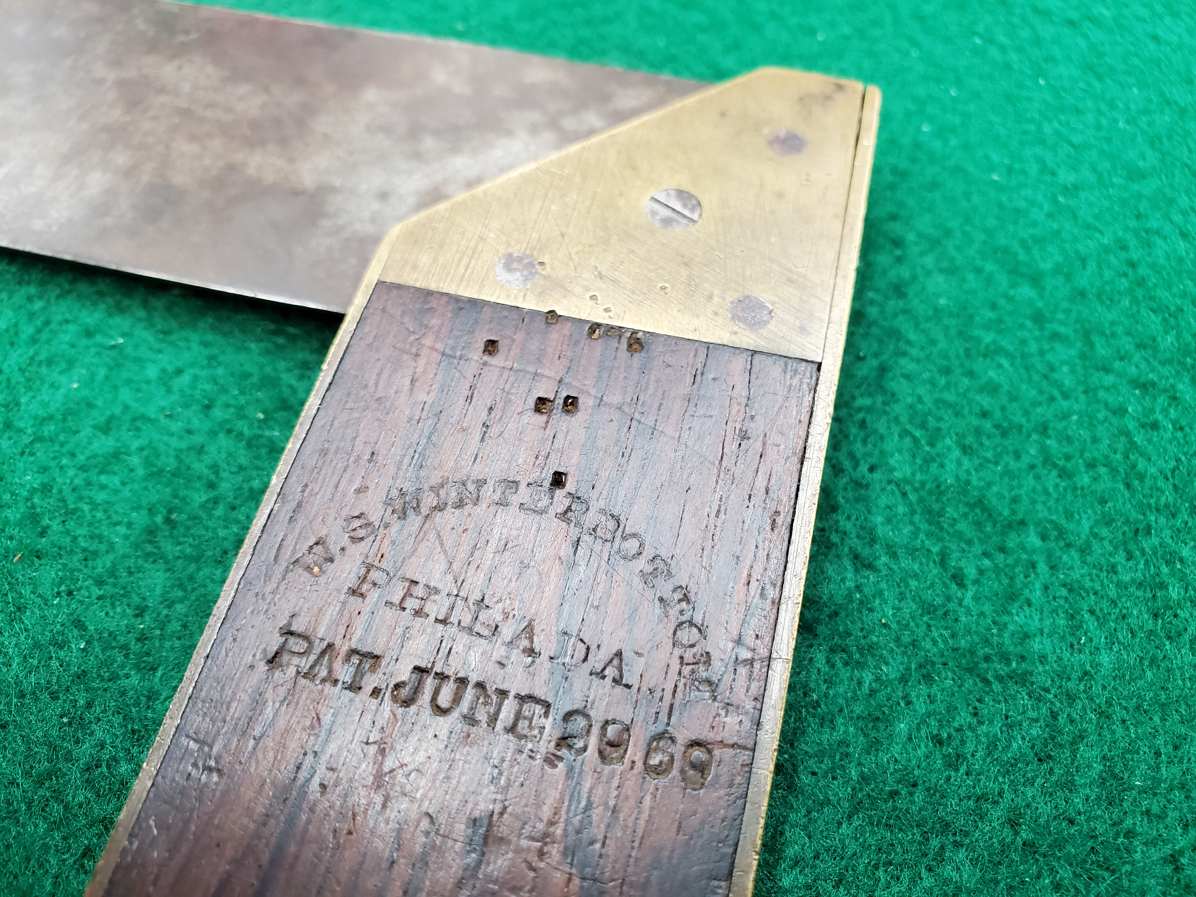 The Type 1 is a traditional miter square as was being produced by countless other companies at the time. The catalog refers to it simply as "Miter Square with Double Plated Handle". It features a rosewood handle with brass plating on both sides held on by screws. Four rivets with brass washers hold the blade to the handle. This is a very uncommon square, and looks similar to many others produced around that time period. It is not marked and examples must be closely compared to the catalog illustration. It was only offered in 1870. (12", 10", 8")