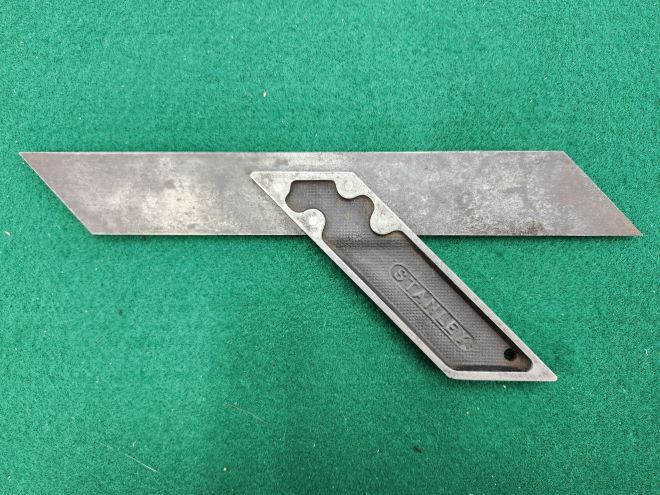 Known as the “Patent Combination Try Square & Bevel” when first introduced, it was numbered 24 in 1888. These are based on the April 5, 1864 Shelly patent. The size is measured by the inside edge of the large arm of the blade. Type 1 had no slot in the blade and only rotated around the central point. These were only made for a few years at the start of production before the slot was added, giving the tool more versatility, and creating the Type 2. The Type 2 bevels have variations in the design of the thumbscrew. See the No 25 type study for more details. In 1879 the wingnut was switched to a lever, which is the Type 3. Stanley introduced the lever in 1877 and it originally had a flat face. It seems logical that these would appear on the No 24 as well, but the author has seen no examples. (12", 10", 8", 6", 4")