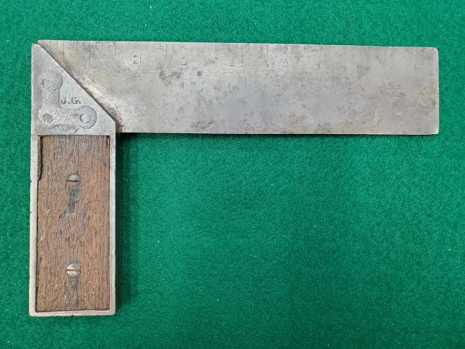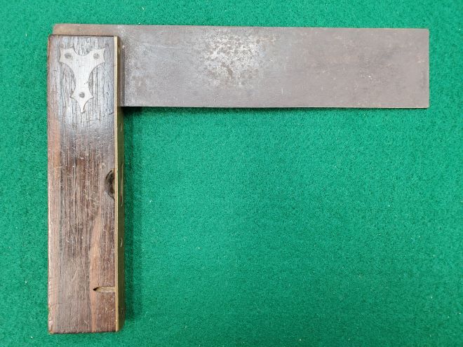 Type 2 transitions to an infill style handle and is now called "Improved Miter Square". It is not until 1888 that a permanent model of No 16 is assigned. 1 or 2 screws (depending on handle size) pass through holes in the handle and screw into the other infill, essentially clamping the two thin pieces of walnut onto the handle. The earlier variation features rounded tops and bottoms of the handle. The later variation changes these to be flat. It is not known when exactly this change happened, but neither variation seems to be more prominent than the other. They are marked with the arched Stanley “Beehive” mark on the blade. (12", 10", 8")